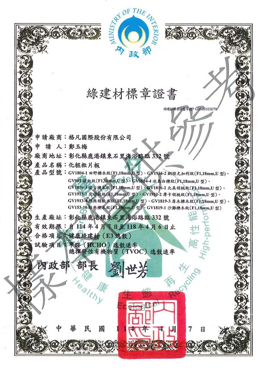 內政部營建署已開始推行綠建築標章,提升居家品質從環保概念做起。所謂系統板材又稱為塑合板 (PATICALE BOARD) 其作法是將橡木、櫸木等十餘種木材打碎成纖維粒片粒狀,再以特殊用膠膠聚合之粒片合板,其製作過程不需砍伐巨木,亦可利用再生木製造,具有再生天然環保無污染等的特性與優點,是最符合自然生態的環保素材。
