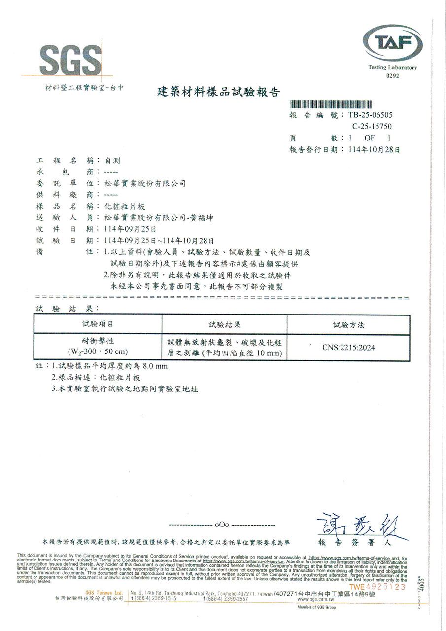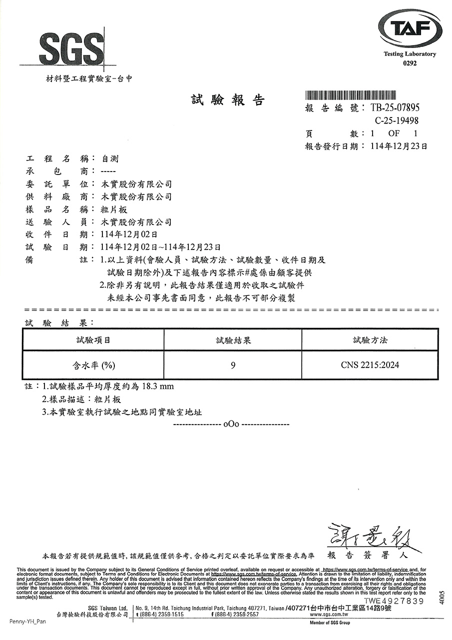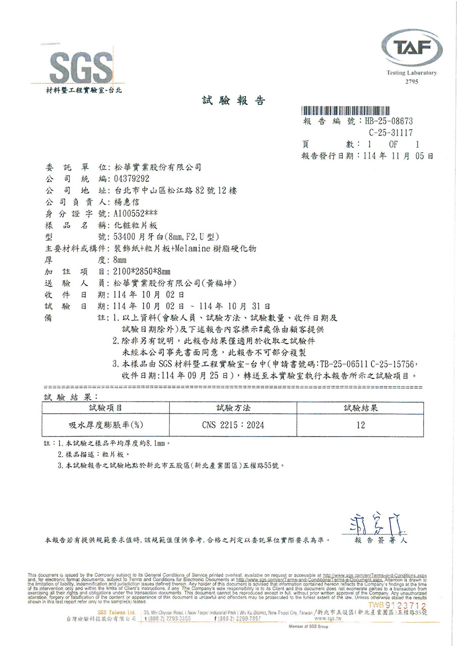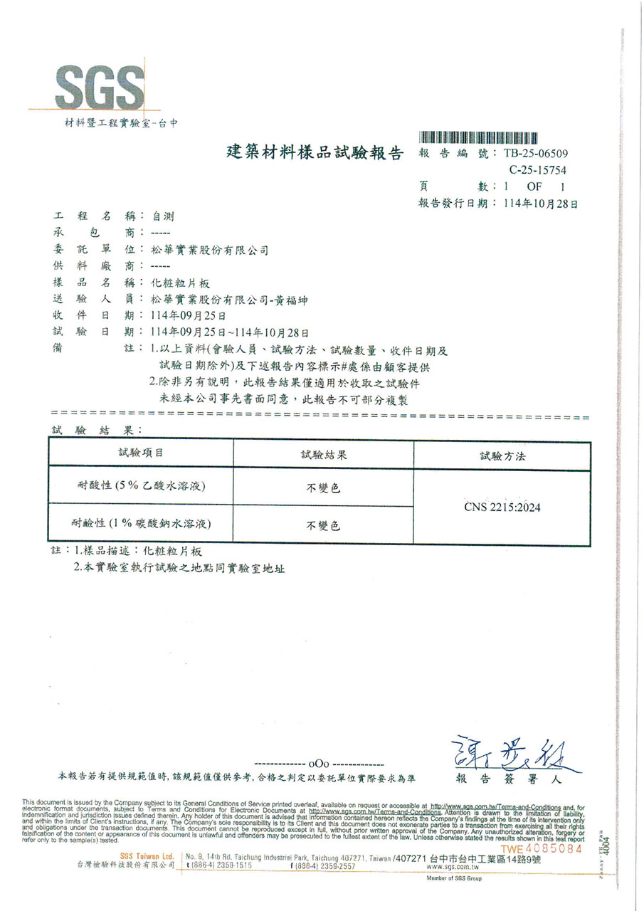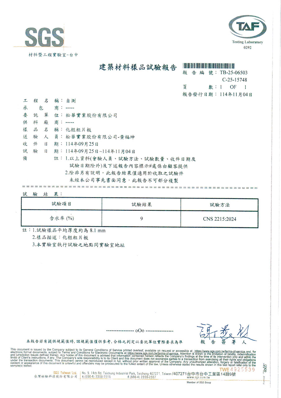 因應台灣海島型潮濕氣候,居家櫥櫃所使用的板材必須符合防潮與低甲醛釋放量的高標準。系統櫃所使用的塑合板材在歐盟檢測標準EN312項目中EN317防潮力測試及EN321耐濕測試所規範的限值(如下表),歐盟標準EN312以V313條件下濕循環測試方法:在24小時的浸水循環測試中,其厚度膨脹率必須低於標準值。