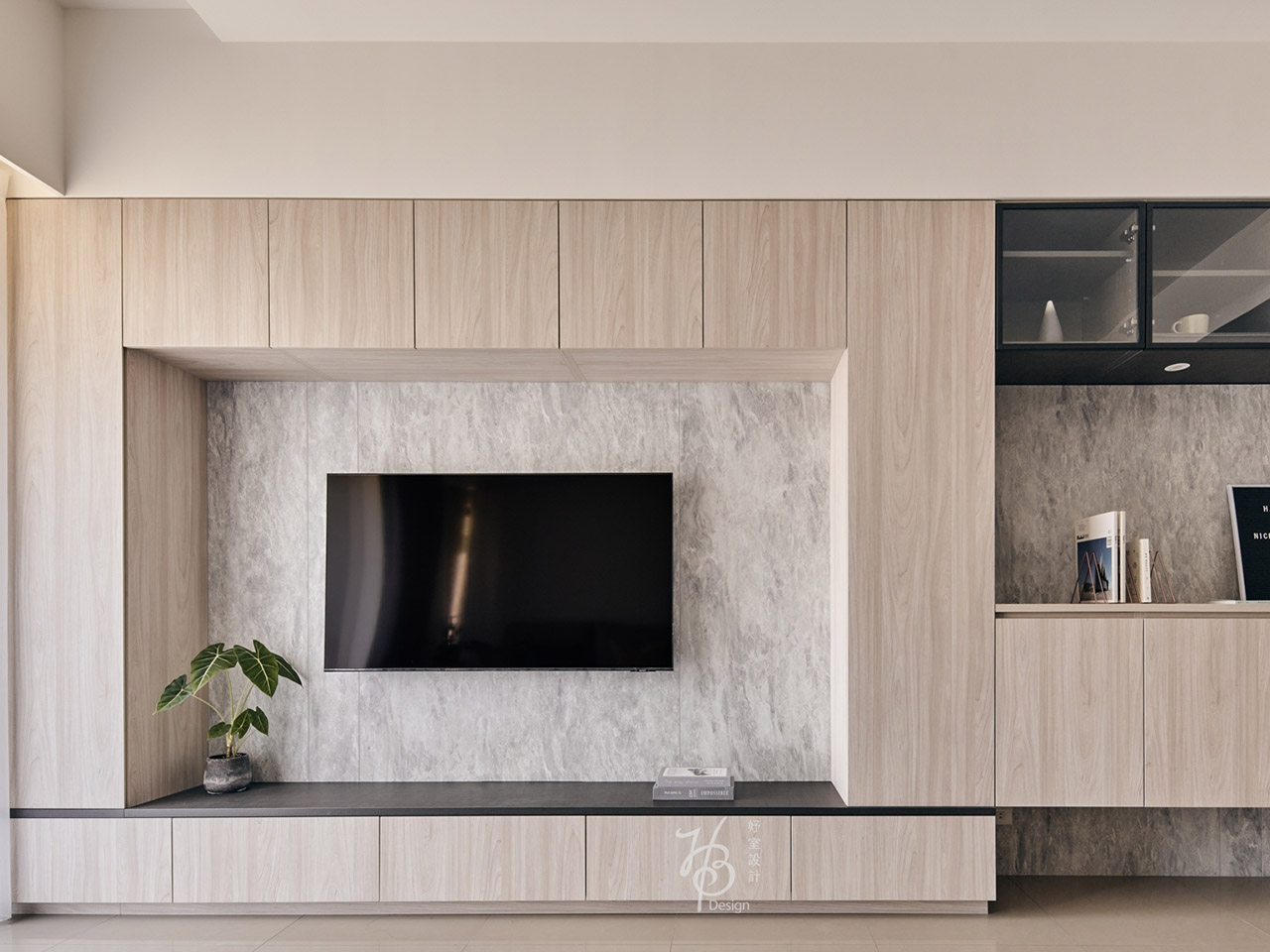 電視櫃瑞士瑜木色搭配棉織鐵灰與黑鋁框門,