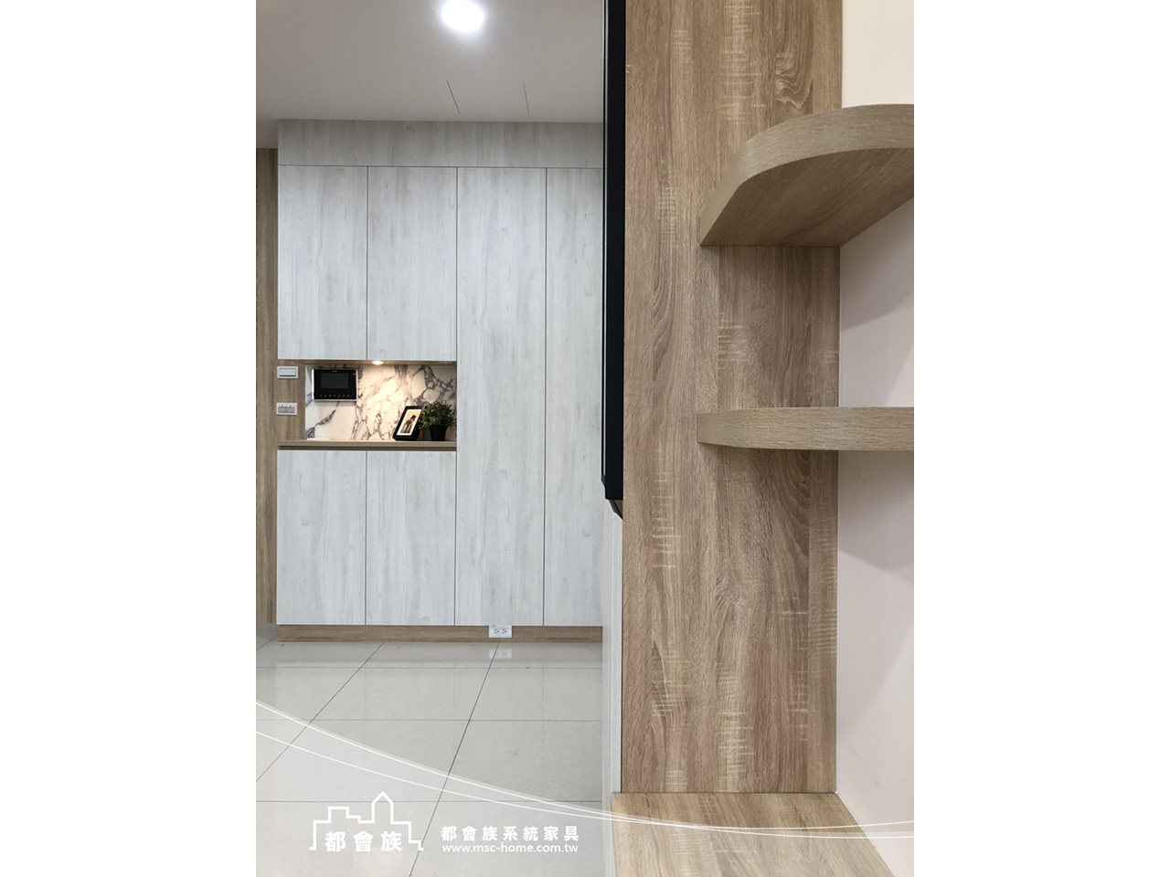 此案例為過嶺謝公館, 公共區域在有限的空間內, 劃出收納性充足的櫃體, 利用燈光及不同形式的搭配, 同時擁有收納及展示的機能。 主臥設計L型衣櫃結合化妝桌, 一併滿足了男女主人各自的使用需求。 小孩房從衣櫃到床組連貫式規劃, 讓空間使用極大化, 藍白配色更顯活潑。 整體規劃符合屋主期待, 成就夢想家的藍圖。
