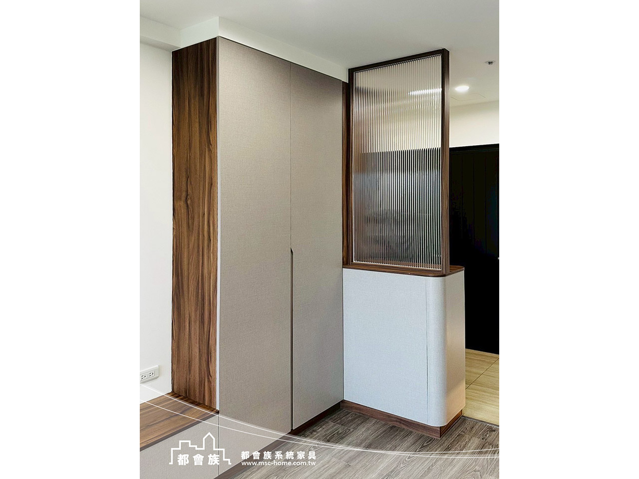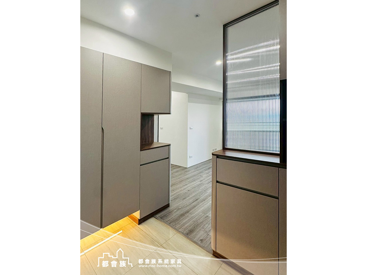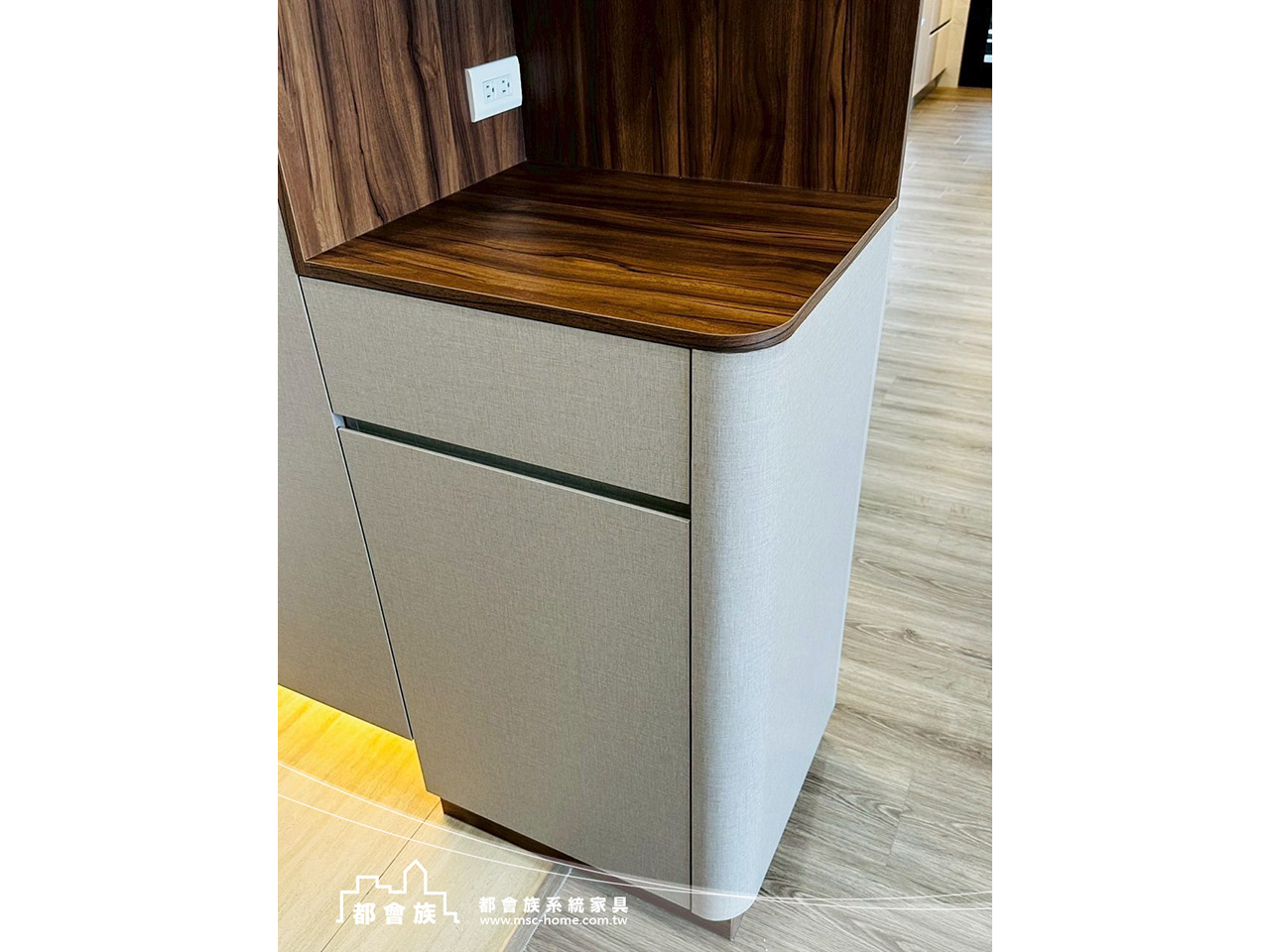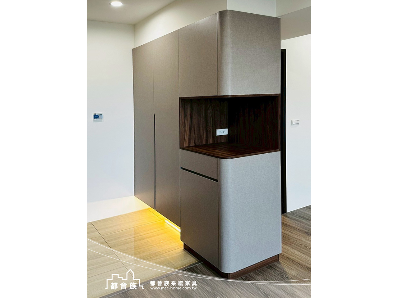 這次與立丞設計合作, 從玄關鞋櫃、電視櫃、電器櫃到廚房區與臥室, 整體風格一致且細節到位, 溫潤的木紋搭配低飽和布紋門板, 營造出沉穩又溫暖的居家氛圍, 兼顧美感與收納機能, 讓空間井然有序廚區動線流暢, 視覺簡潔俐落, 玄關利用圓弧修邊板去修飾, 並搭配長虹玻璃增加光線與空間的透視, 主臥室的懸空書桌減輕視覺重量, 並保留靈活的地面空間, 打造出一個舒適、實用且耐看的理想居所。