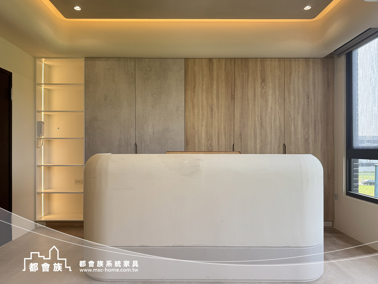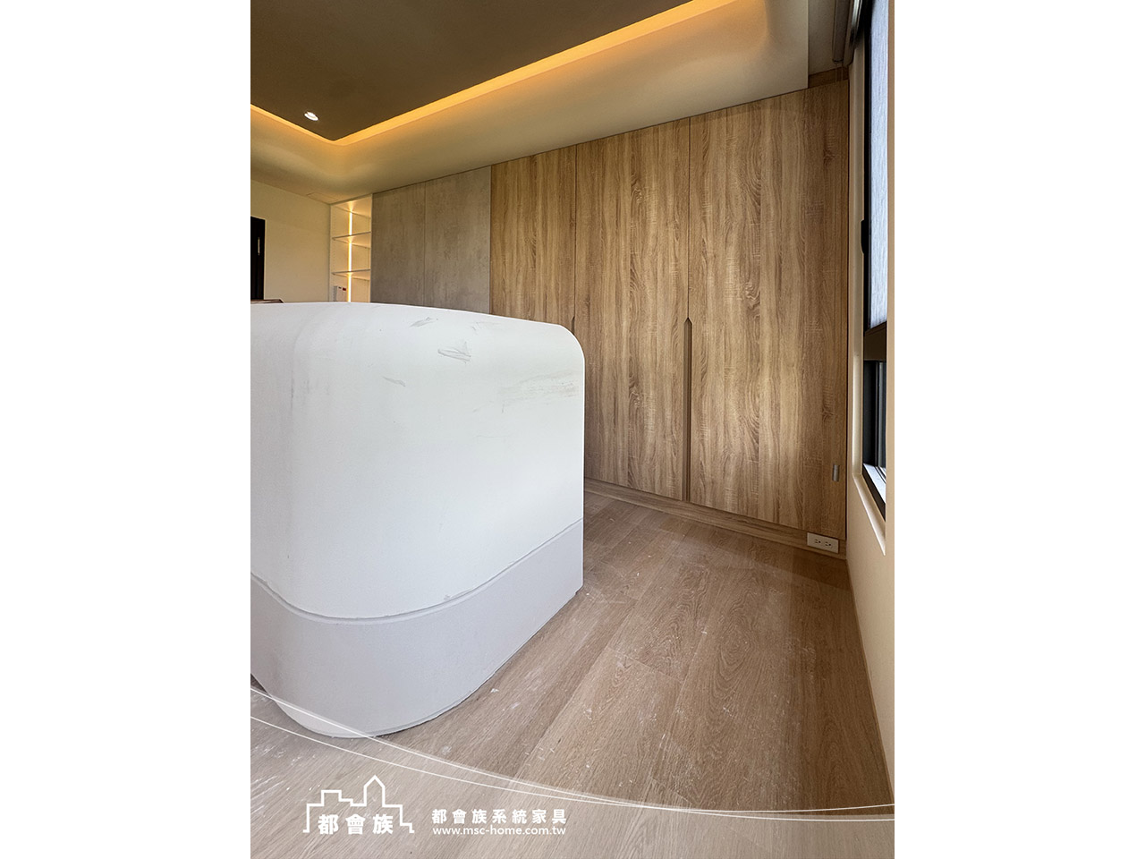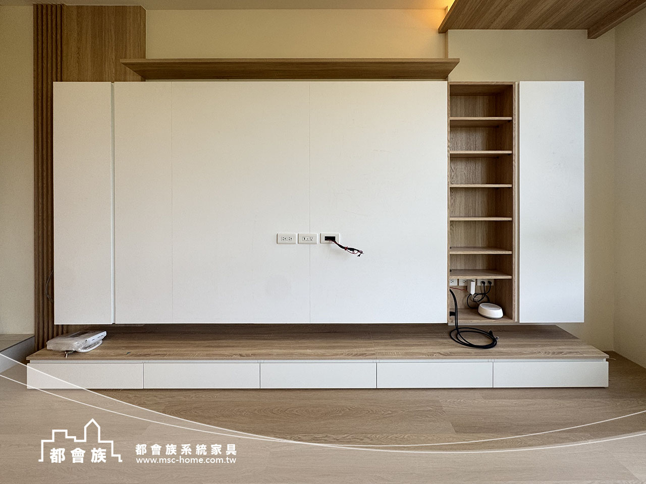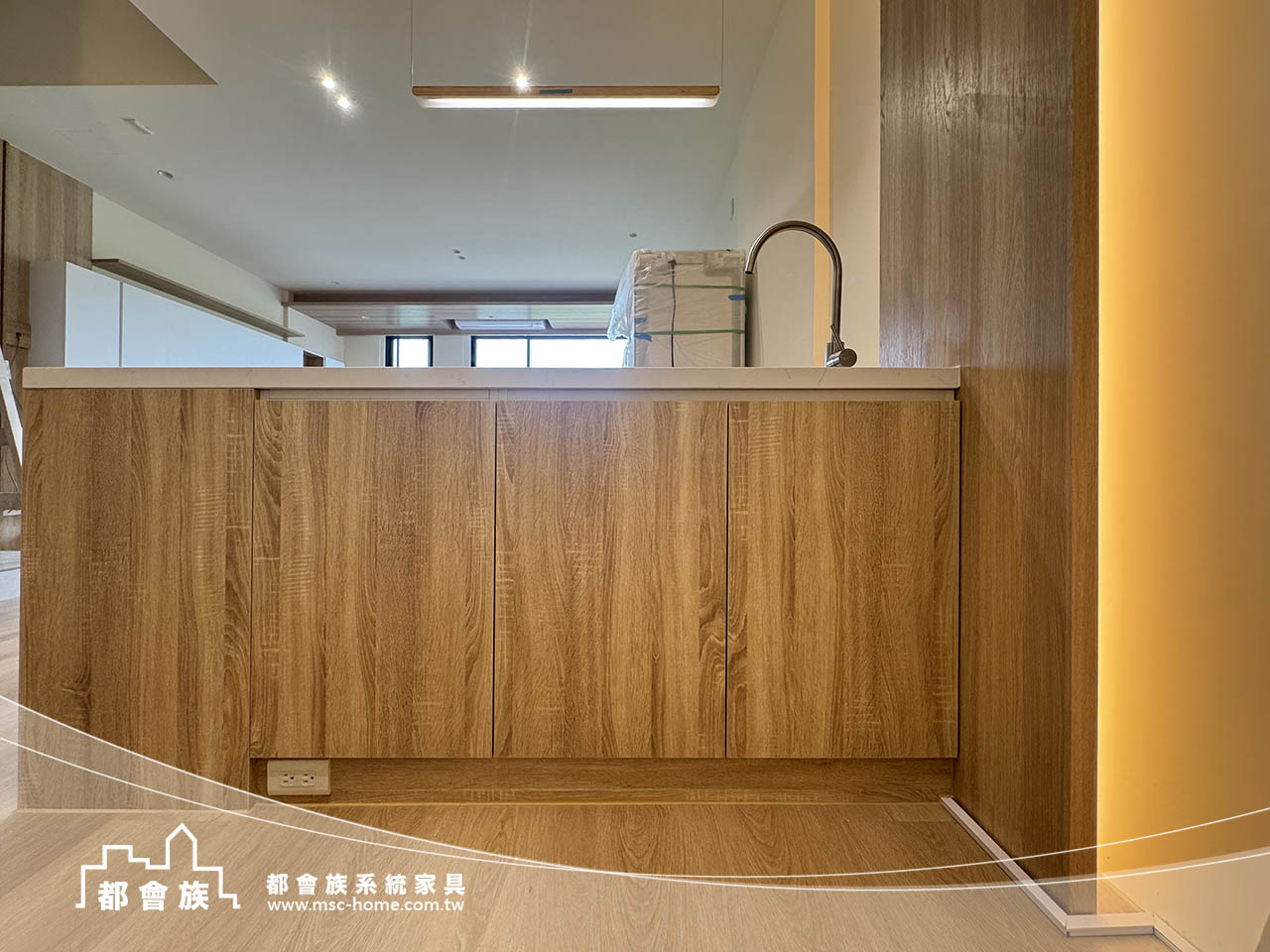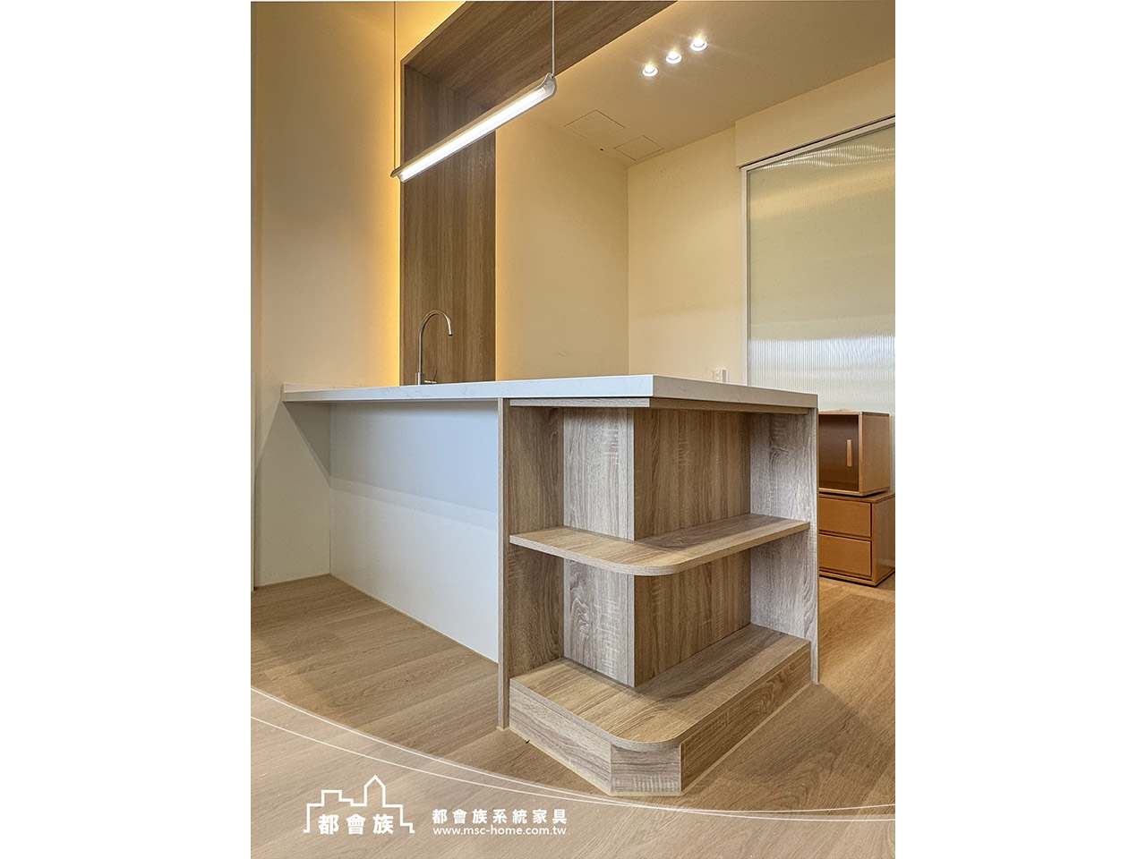 此案件是與吾他川設計合作的案件, 櫃體大致上使用木紋色系, 再搭配局部白色去點綴, 營造出溫馨的感覺。