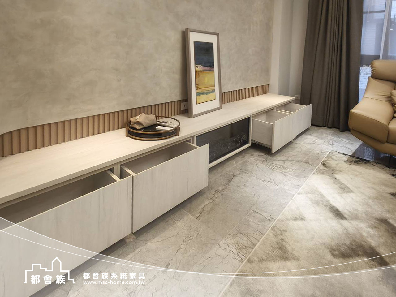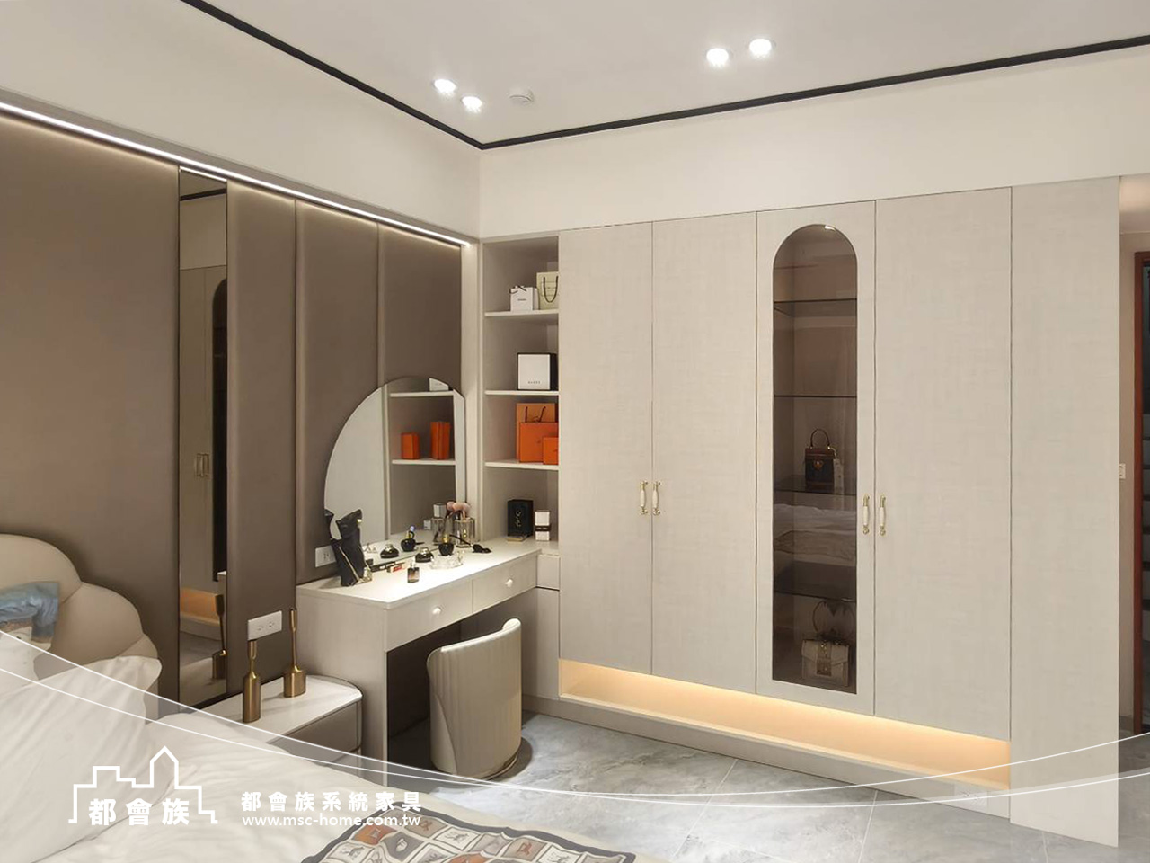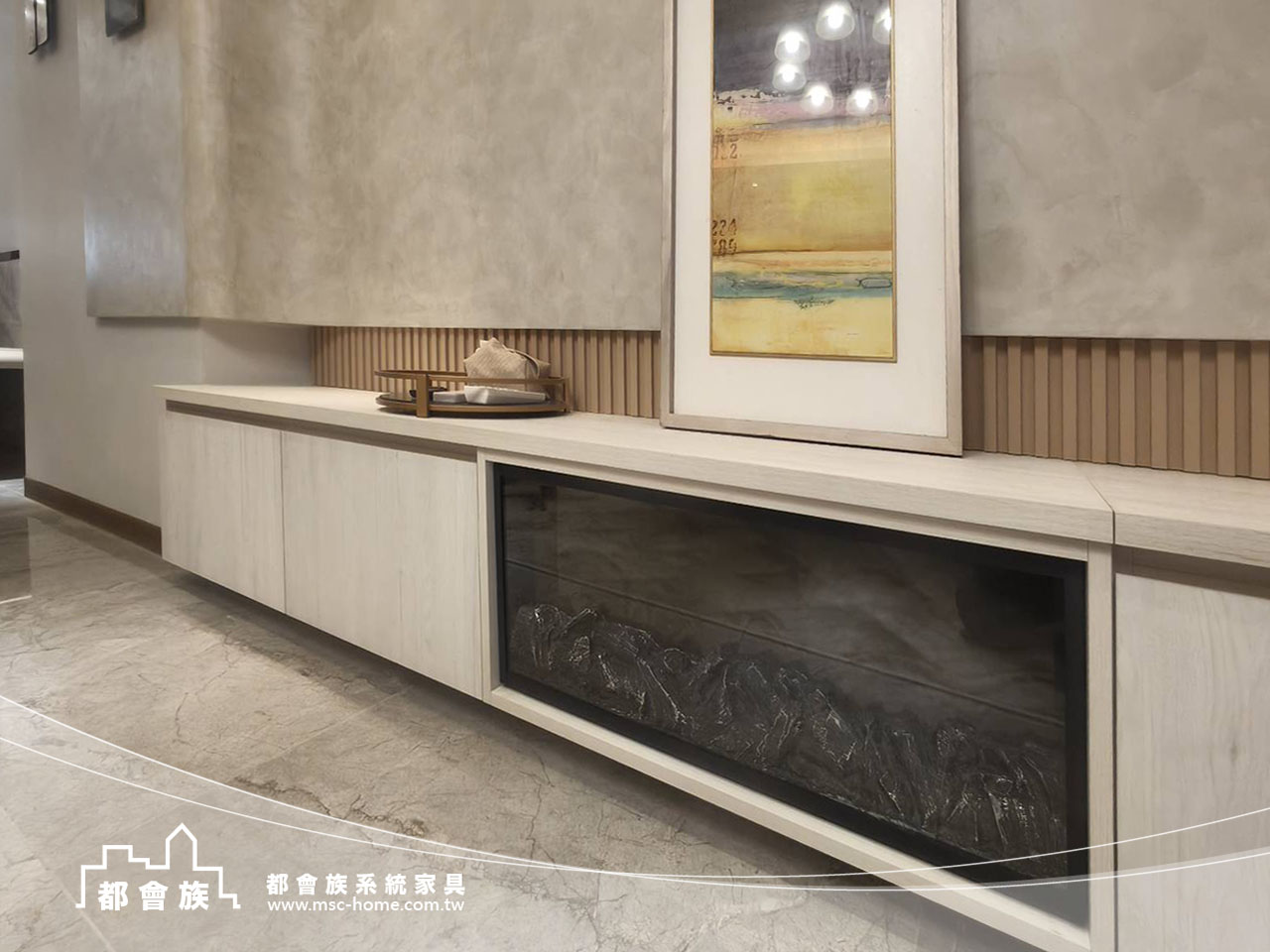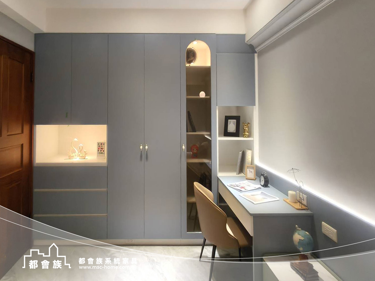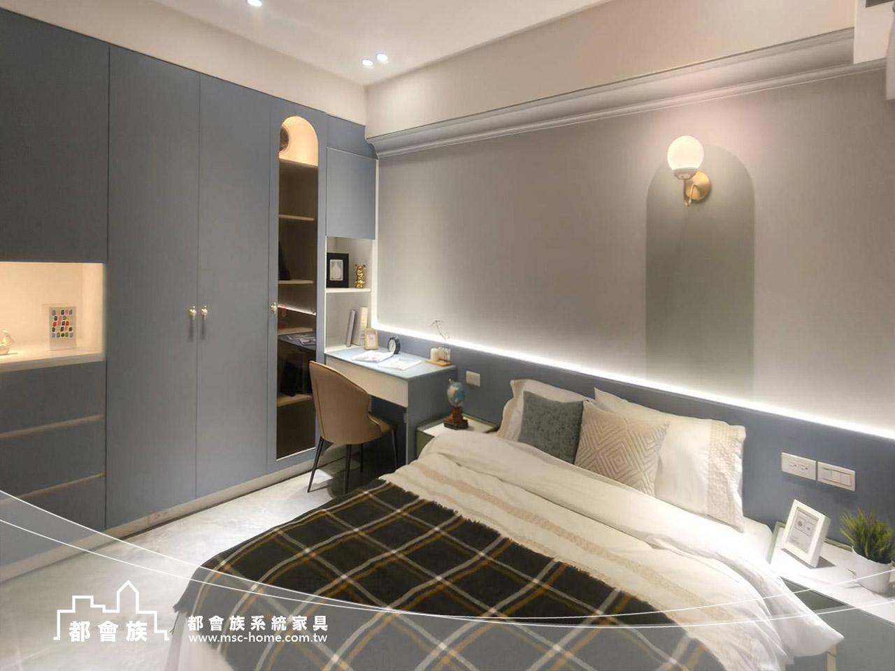 本次案件與禾原設計合作, 電視櫃電子壁爐溫暖加分, S131色搭配木作圓弧壁板質感加分, 餐櫃雙面收納空間不浪費, 與建商廚具完美搭配L型人造石檯面, 次臥室藍色調男生房, 床頭線燈加上左側書桌, 衣櫃中有個巧思圓弧玻璃門, 左側一個小展示空間, 女兒房M47色簡單明亮, 主臥室門口展示玻璃門衣櫃質感加分, 左側入口玄關空間, 加上整面懸空衣櫃, 下方燈光讓氣氛更柔和搭配M174色更顯尊榮。