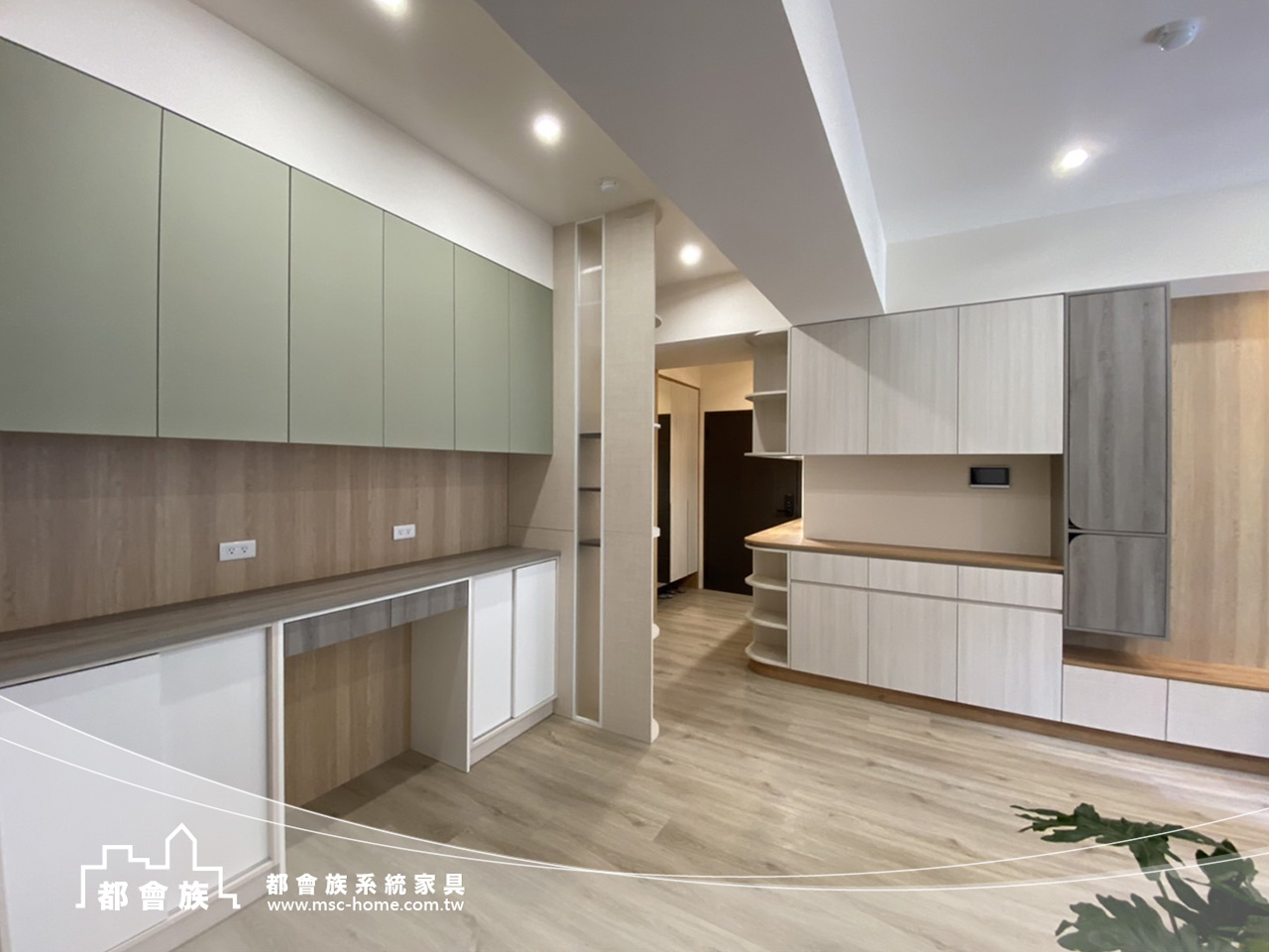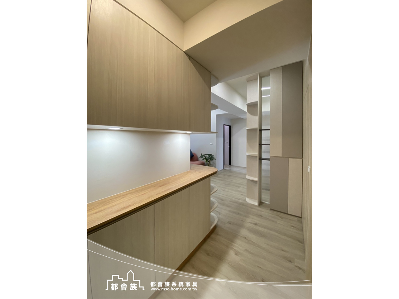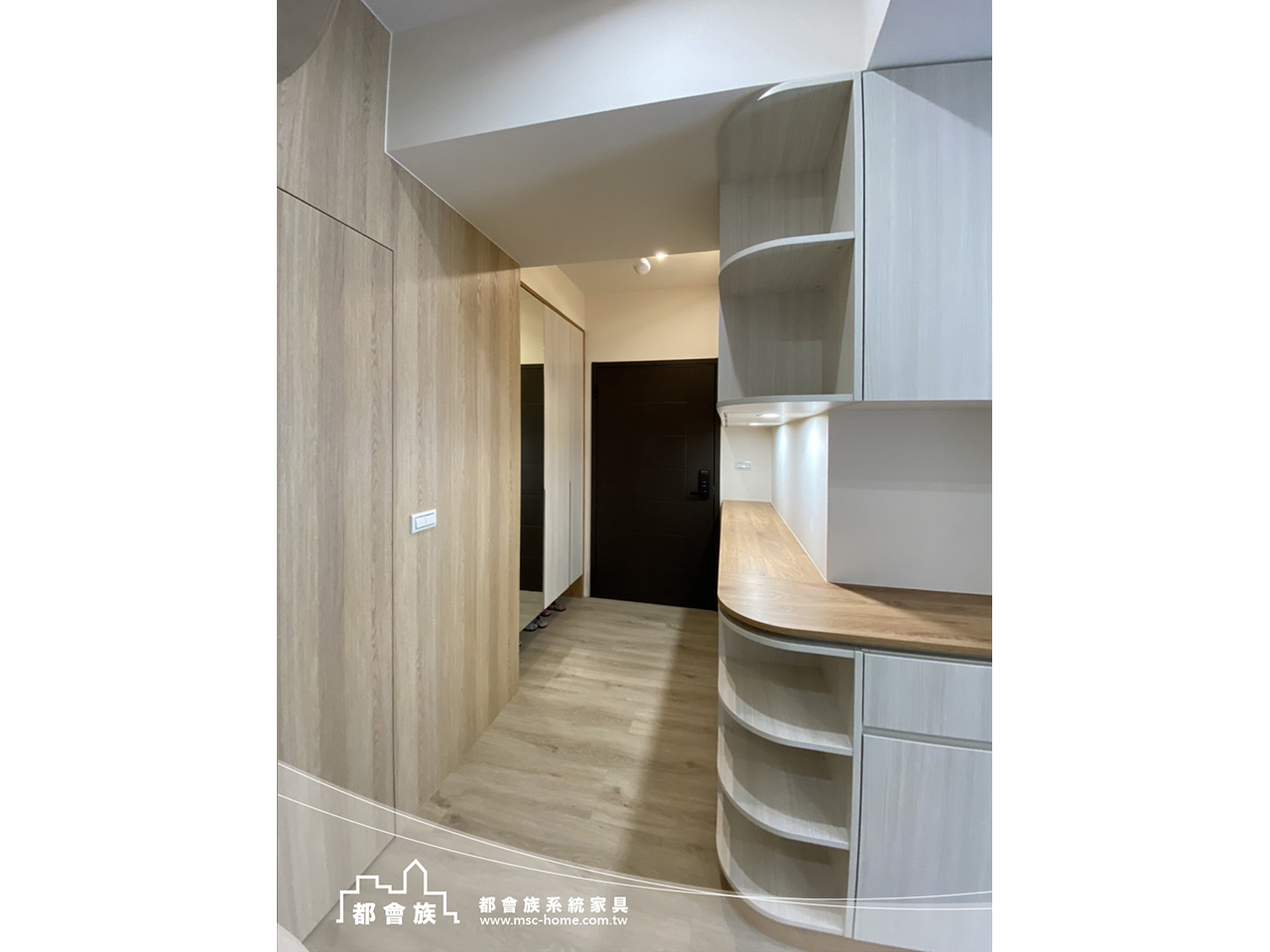 屋主特別喜歡圓角造型, 玄關利用屏風與圓弧規劃, 加上淺色調門板與木紋相互呼應, 可以讓空間看起來更有層次感, 既能滿足功能需求, 又能為整體居住空間增添一些視覺上的享受。
