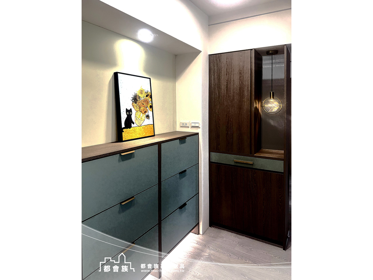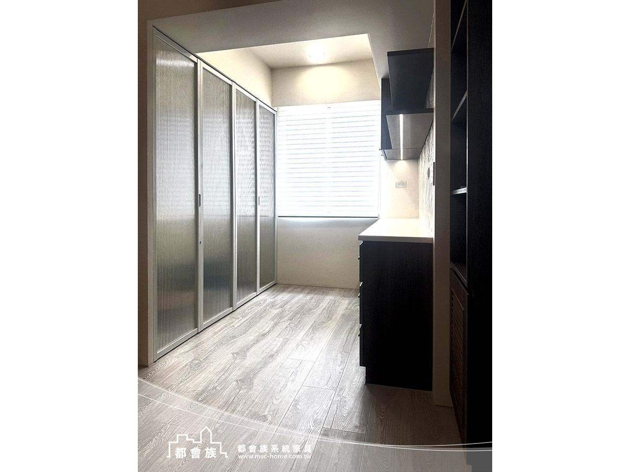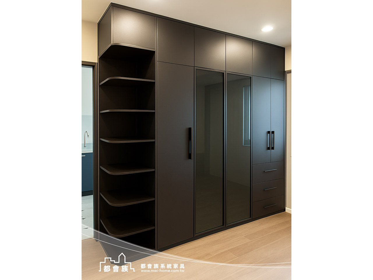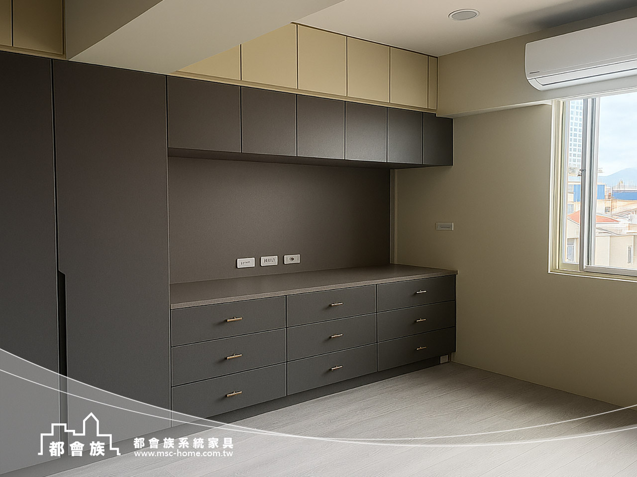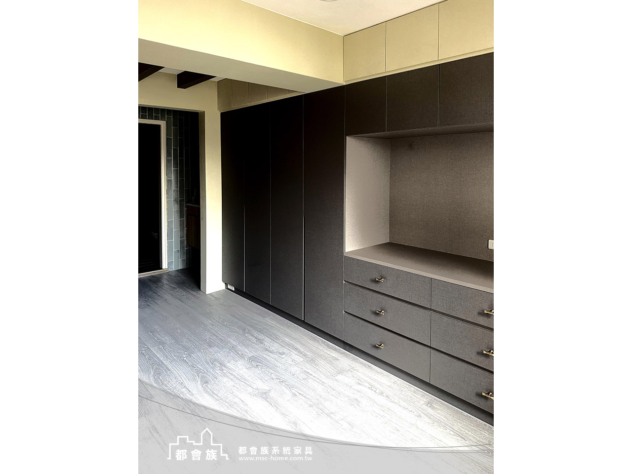 此案是與宜陸工程設計規劃配合 整體的空間設計風格趨於現代簡約、穩重又帶有細膩質感, 整體設計理念: 「低調奢華、機能與美學並重」 透過深色系櫃體、霧面材質與金屬細節的結合, 營造出沉穩、高雅的氛圍, 同時兼顧收納實用性與空間層次感。 設計上避免過多裝飾, 以線條、光影與材質對比取勝。