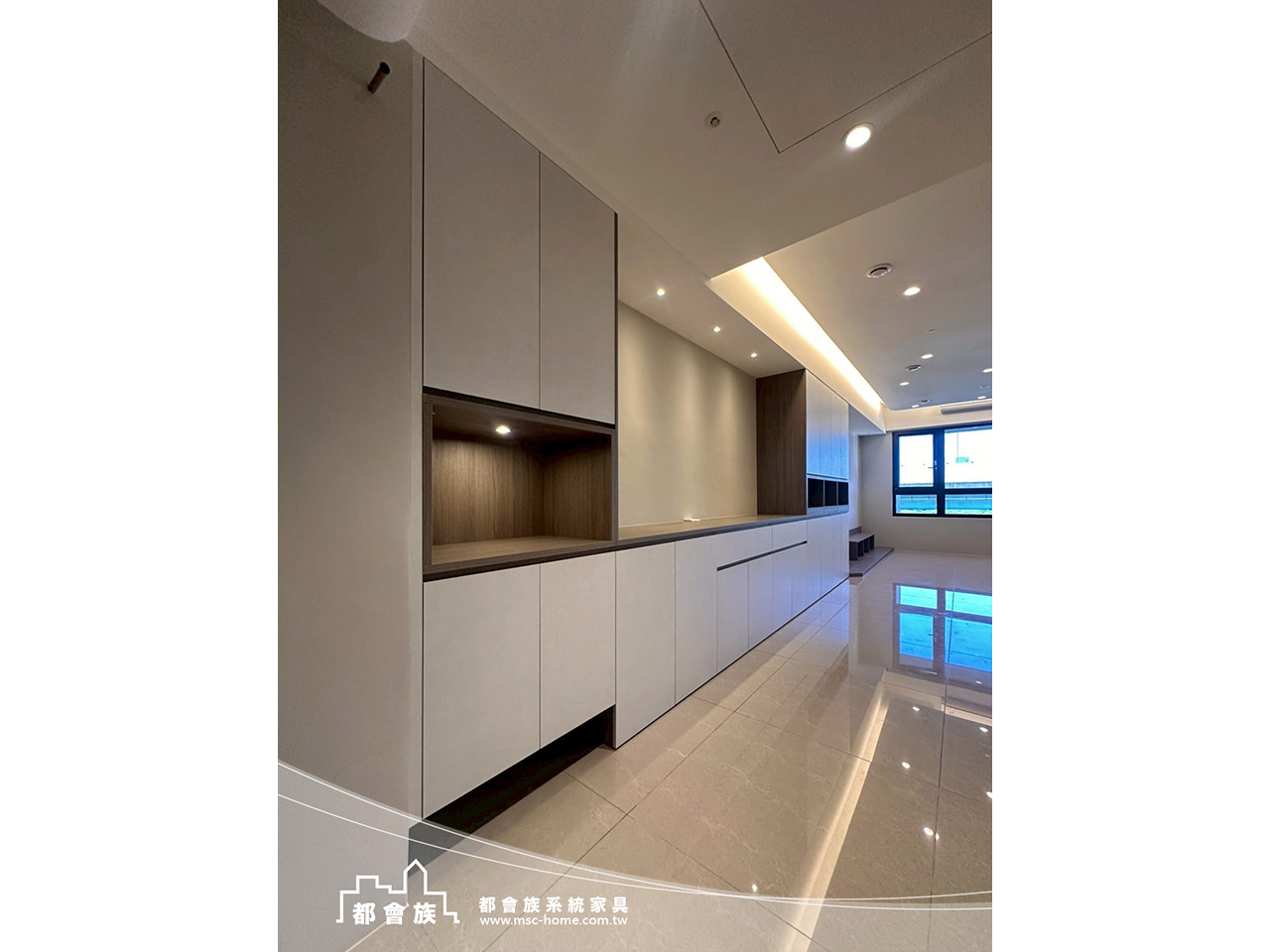 玄關與客廳以大面收納櫃延伸空間軸線連結至電視牆,