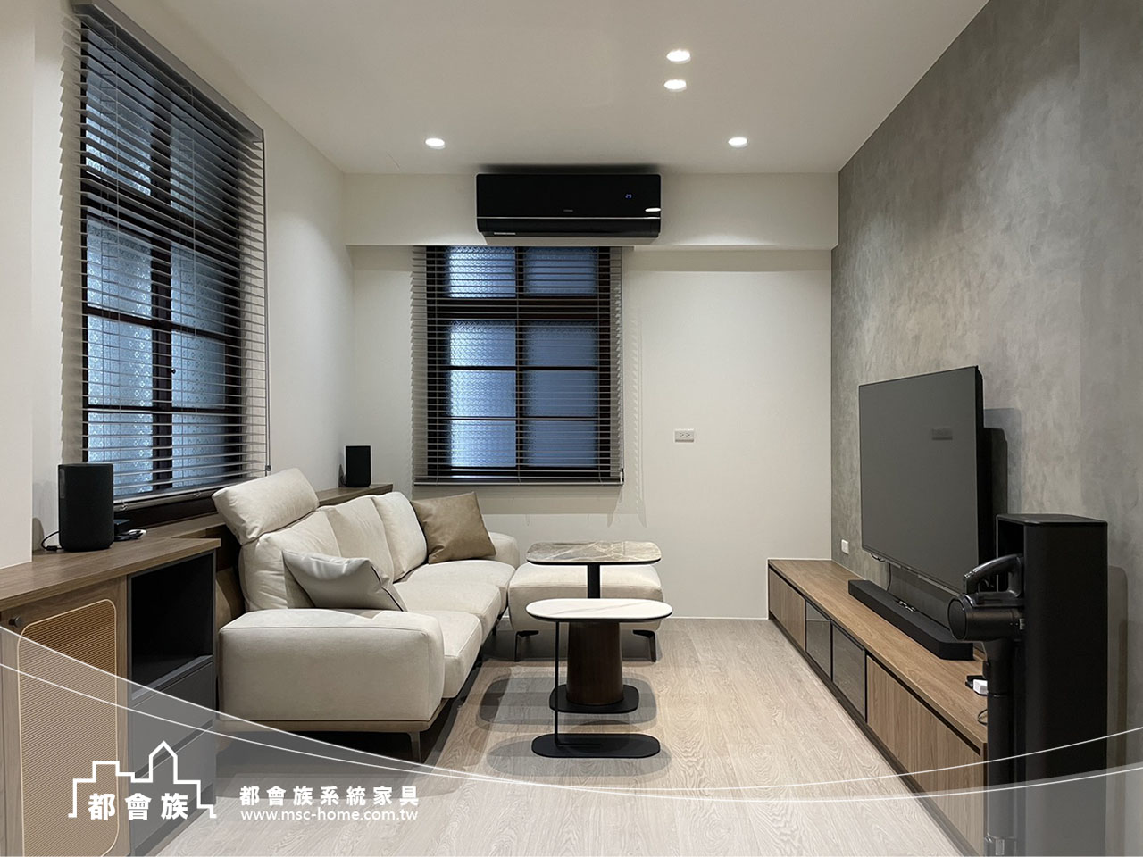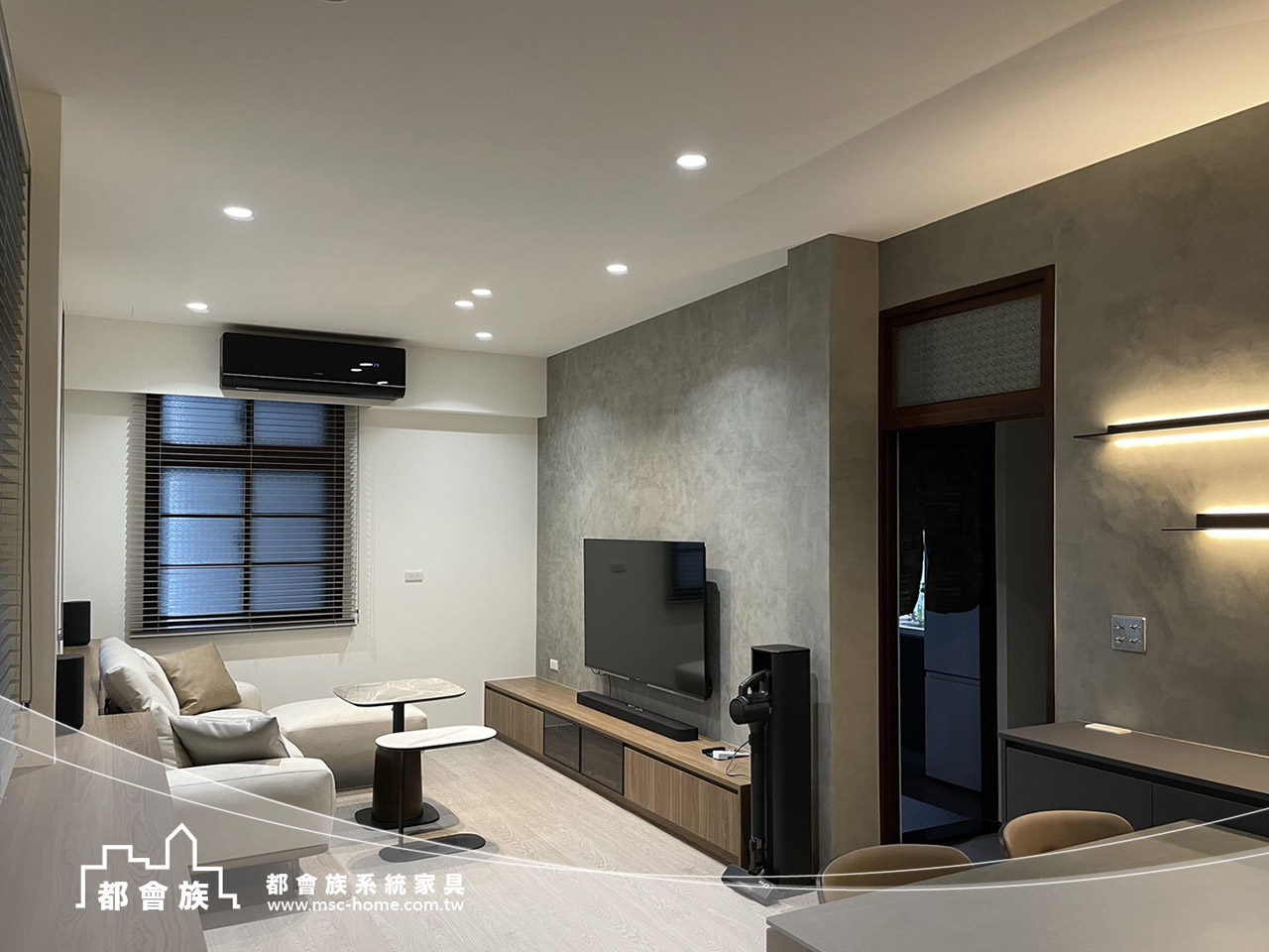 此案為透天舊翻新, 業主想延續舊房子的靈魂, 保留原有的原木窗、木框、海棠玻璃... 因此風格偏向復古風 並且著重在客廳的設計, 以灰色藝術塗料為基底, 搭配沉穩色調的櫃體與編織門片, 再加上LED燈條的點綴 讓新、舊的裝潢產生呼應 營造出和諧的視覺效果。 廚房與房間的配色延續相同的風格 著重在機能上, 規劃所需的收納空間, 簡約而舒適。