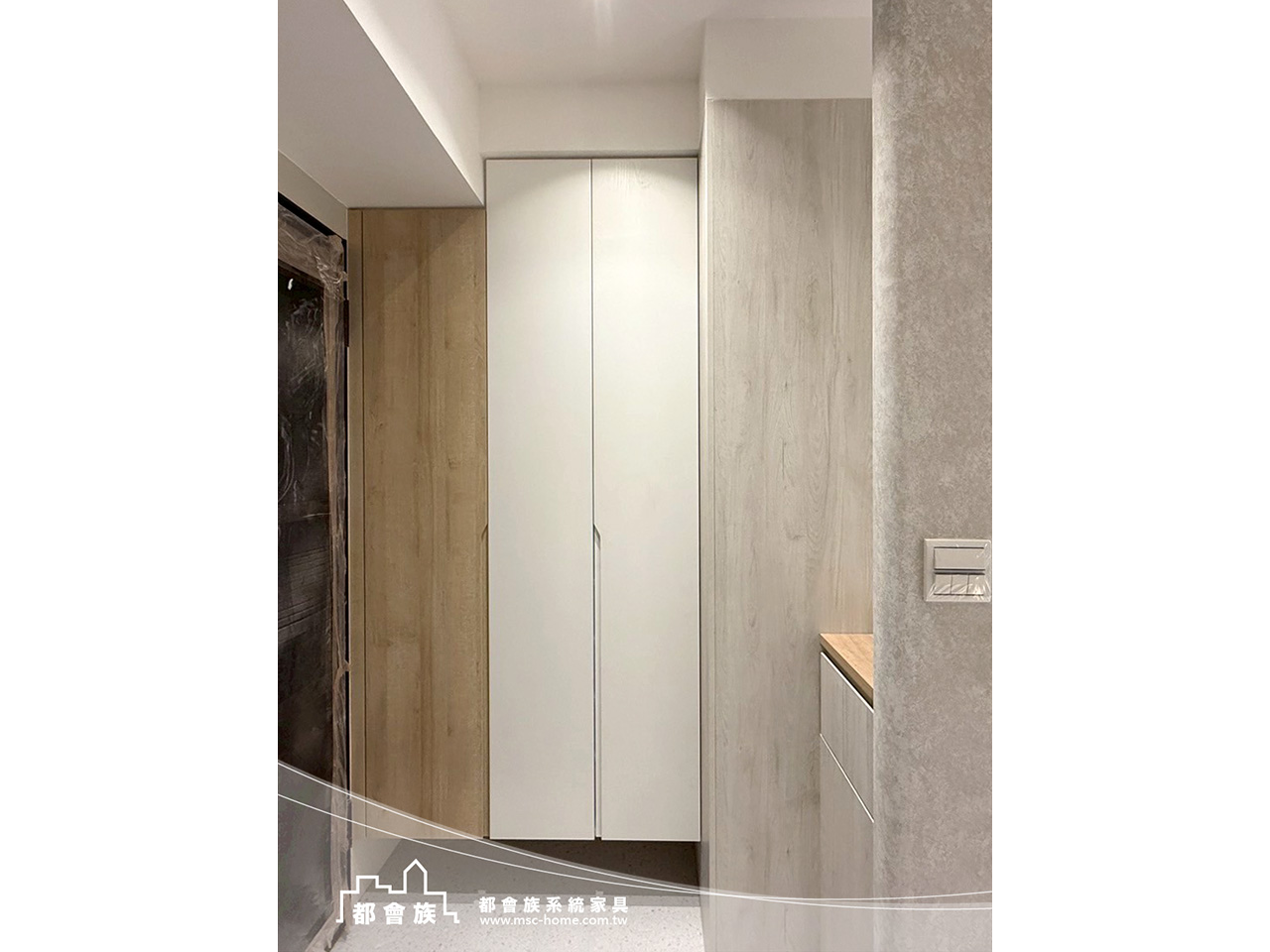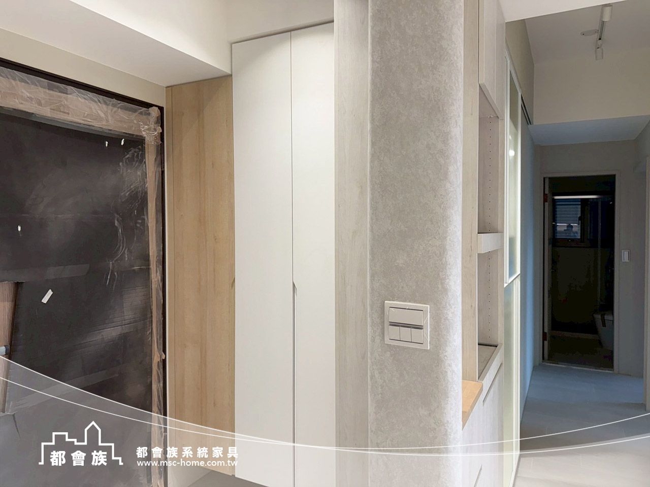玄關到房間的收納動線一氣呵成,鞋櫃、衣櫃、梳化區連成整體,