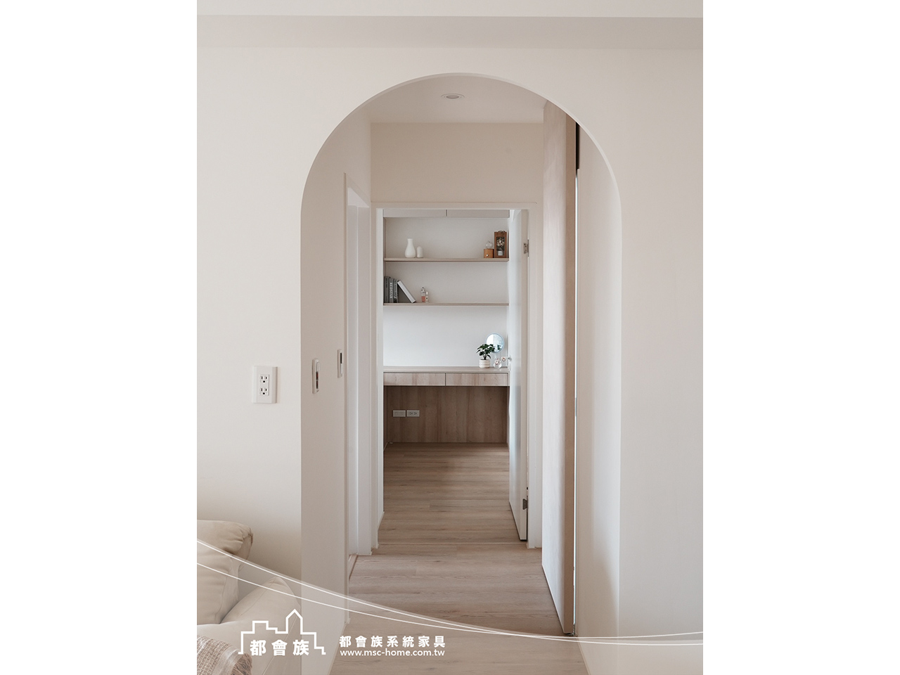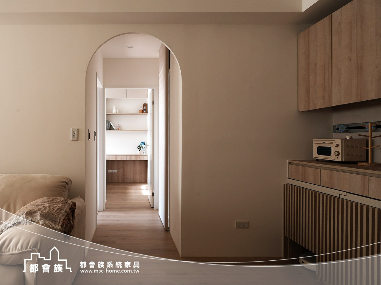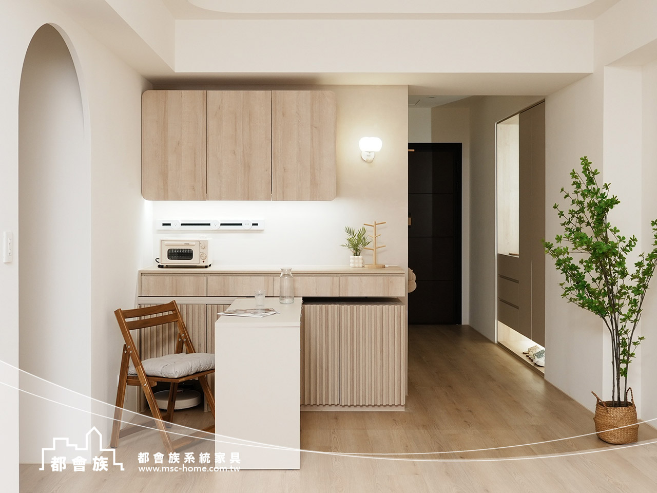 本次案件使用大量的圓角門片和格柵門, 來增加視覺上的豐富度, 強化了系統櫃的活力, 整體配色風格以素色和淺木紋做搭配, 整體簡單舒適的配色, 詮釋了業主對"家"的想像。