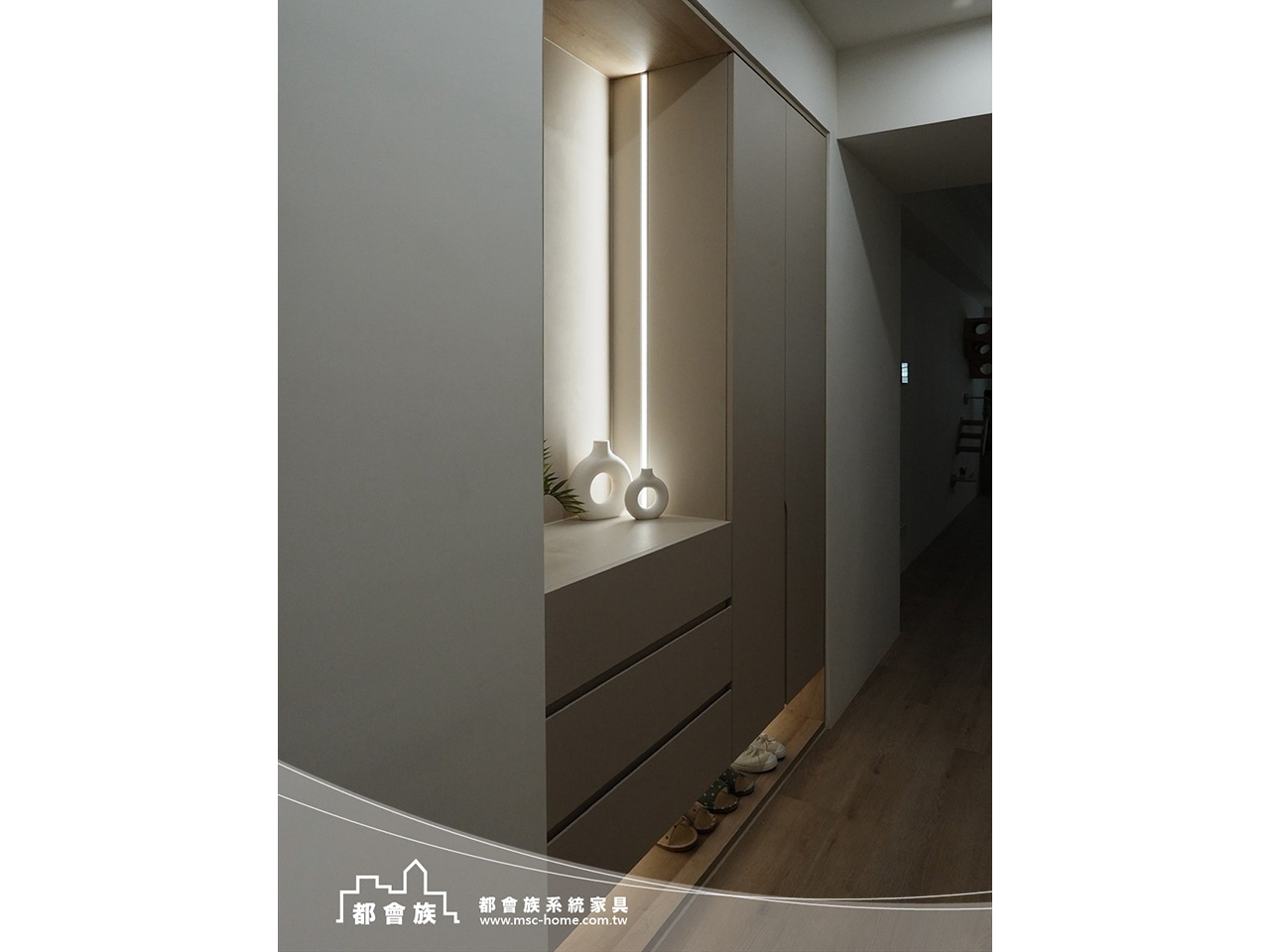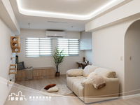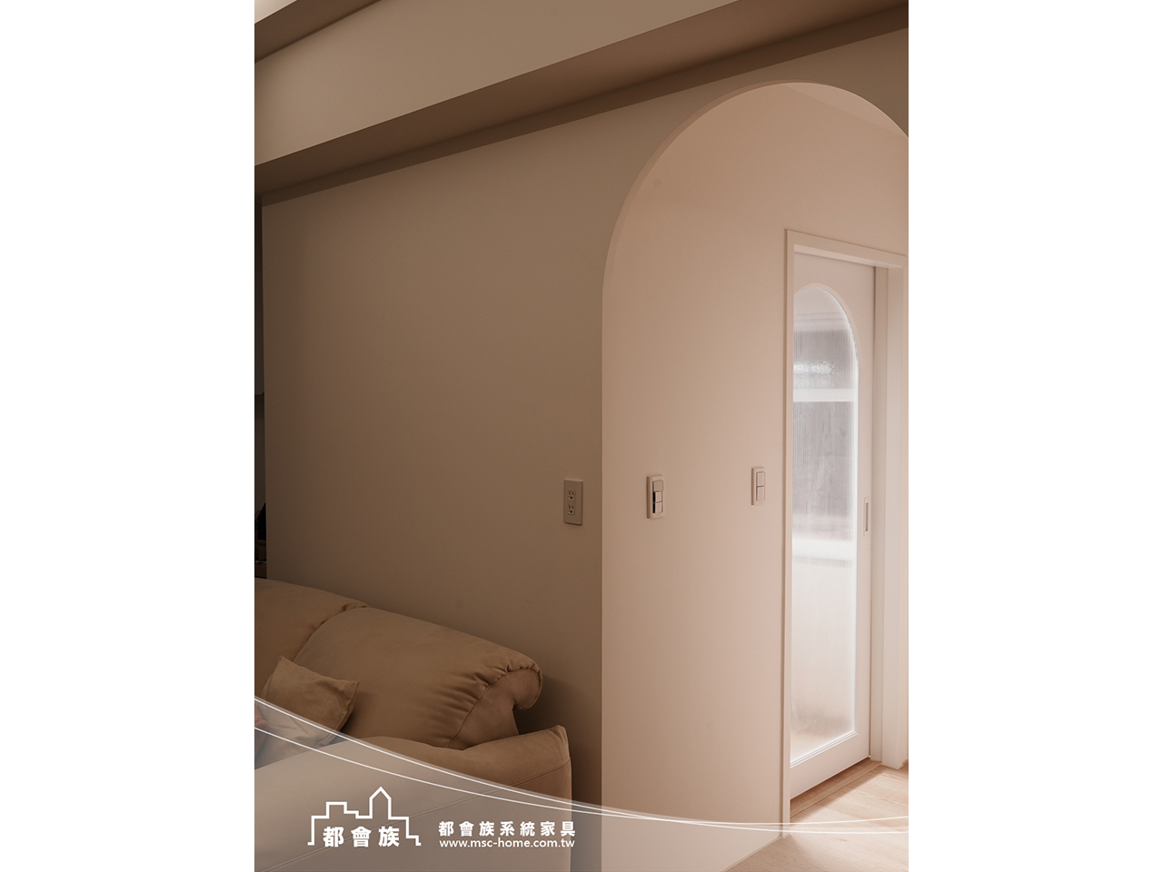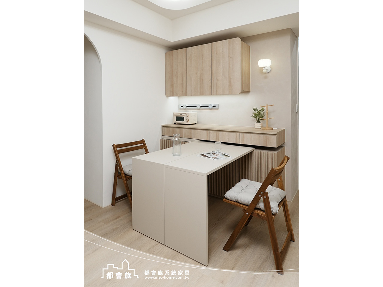 本次案件使用大量的圓角門片和格柵門, 來增加視覺上的豐富度, 強化了系統櫃的活力, 整體配色風格以素色和淺木紋做搭配, 整體簡單舒適的配色, 詮釋了業主對"家"的想像。