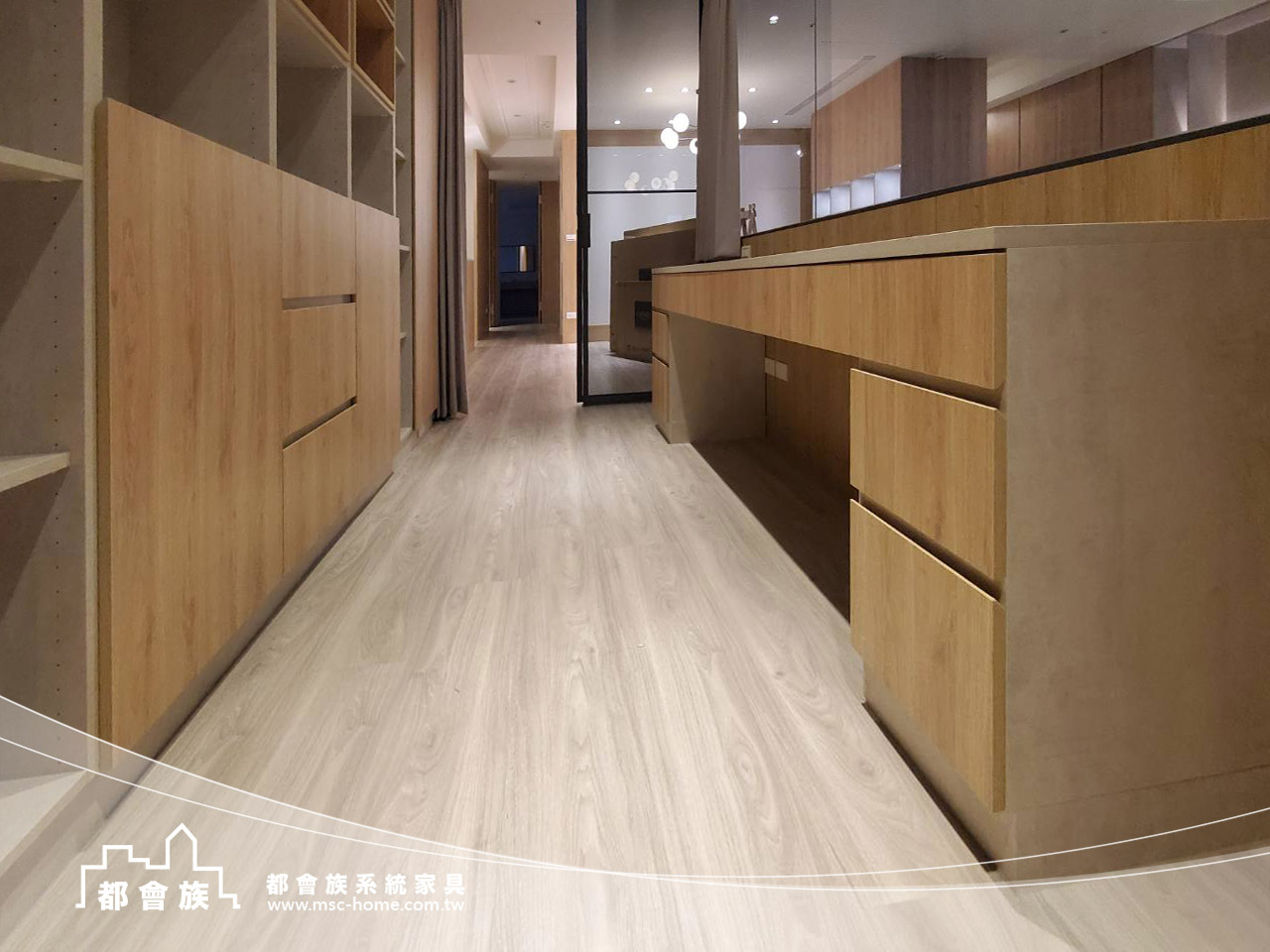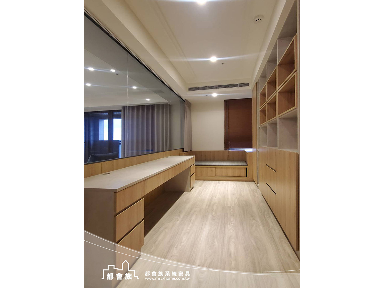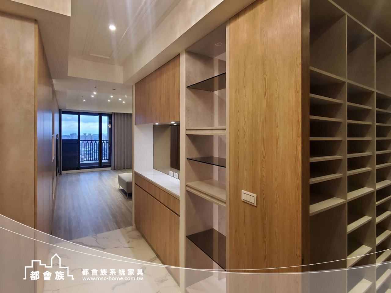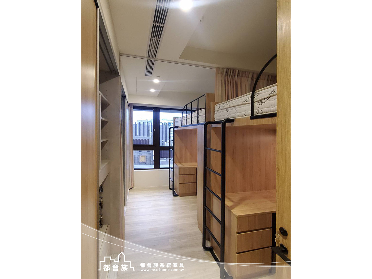 位於林口市區案件, 本案與大覺設計合作, 設計師採用無印風格點綴現代居家風格, 玄關的鞋櫃橡木紋搭配清水模讓空間更顯沉穩靜寧, 餐邊櫃中間開放嵌燈增加造型, 結合玻璃層板, 讓餐桌區有專屬展示空間。 臥室空間也是一貫的木質調, 小孩床組也是利用系統櫃收納方式完成, 讓空間充分滿足。