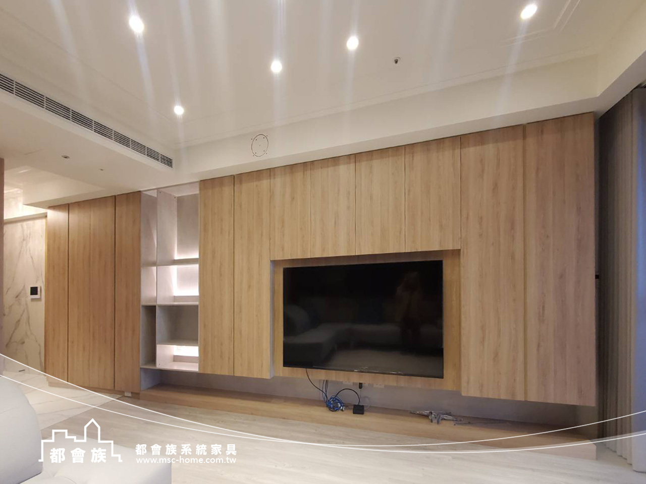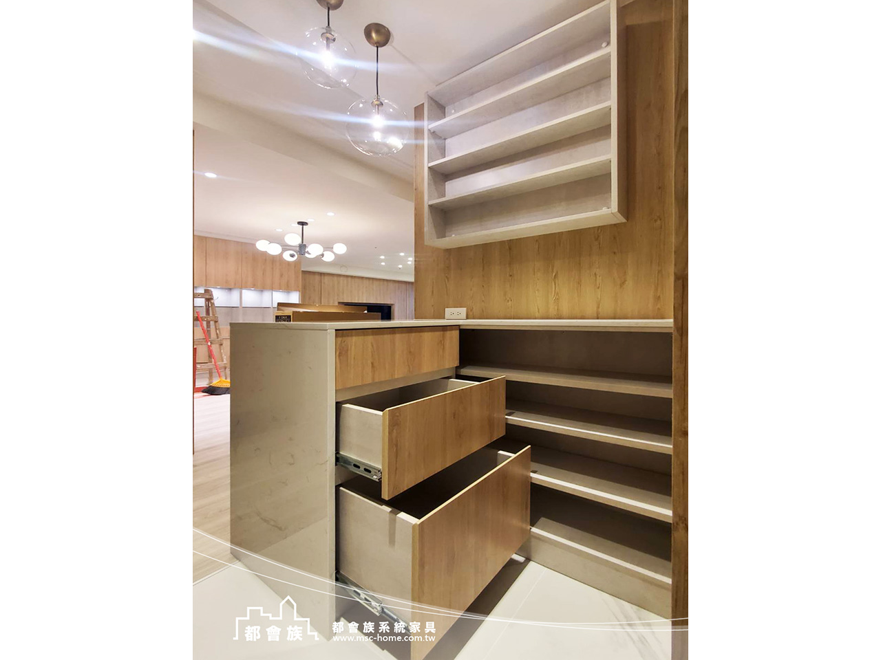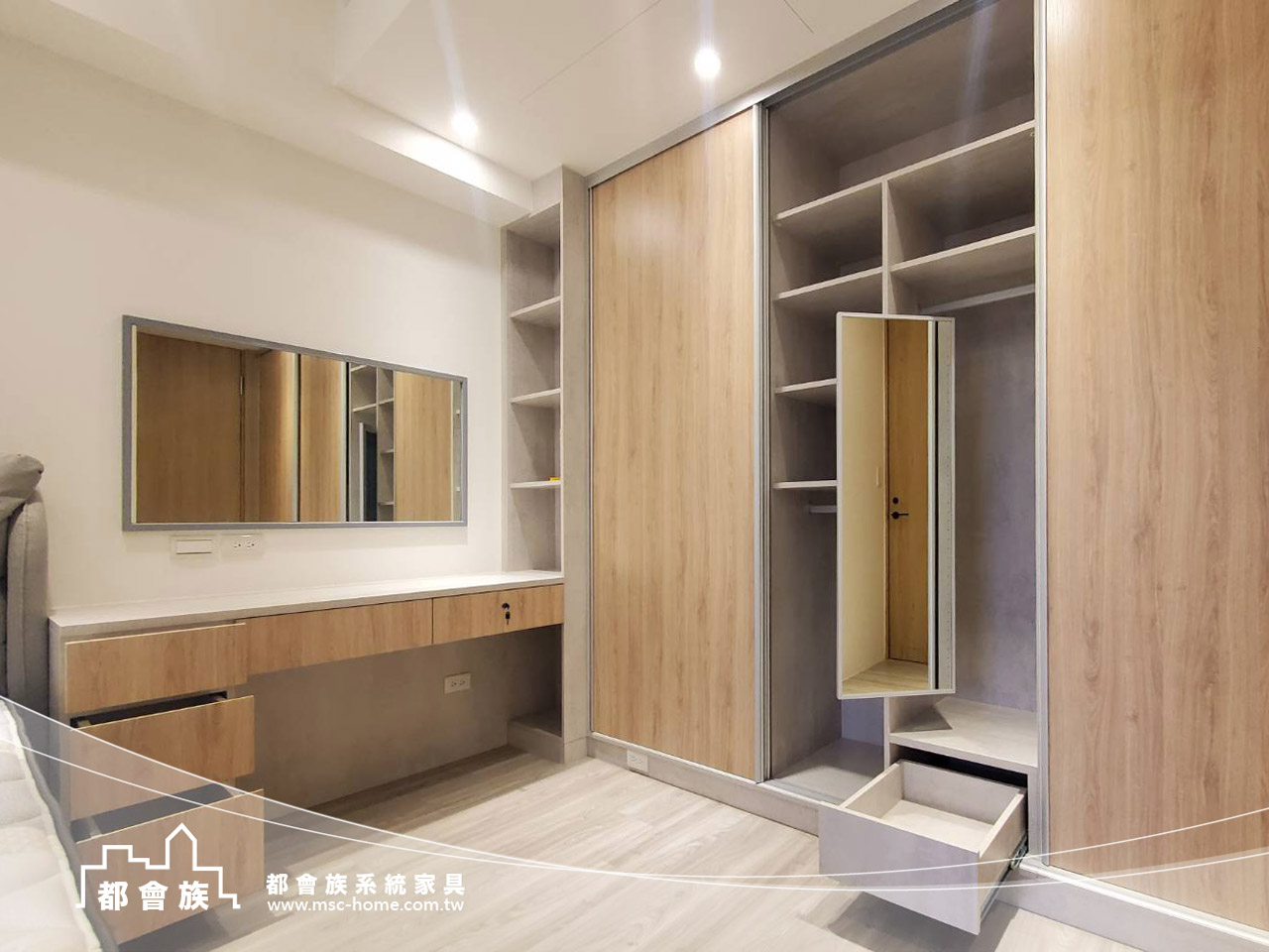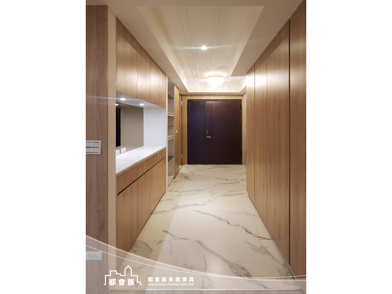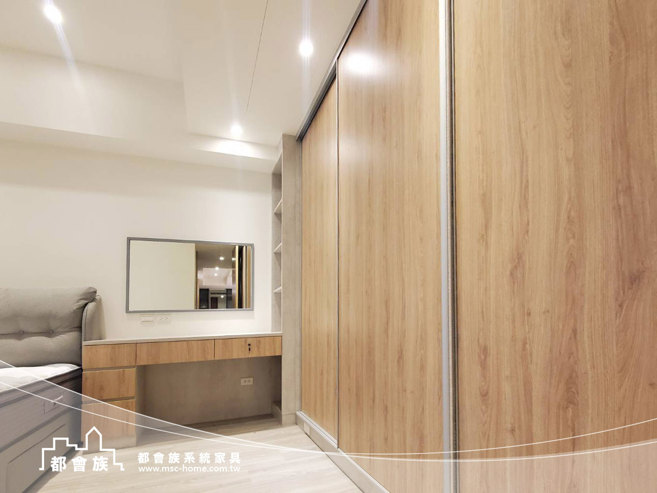 位於林口市區案件, 本案與大覺設計合作, 設計師採用無印風格點綴現代居家風格, 玄關的鞋櫃橡木紋搭配清水模讓空間更顯沉穩靜寧, 餐邊櫃中間開放嵌燈增加造型, 結合玻璃層板, 讓餐桌區有專屬展示空間。 臥室空間也是一貫的木質調, 小孩床組也是利用系統櫃收納方式完成, 讓空間充分滿足。