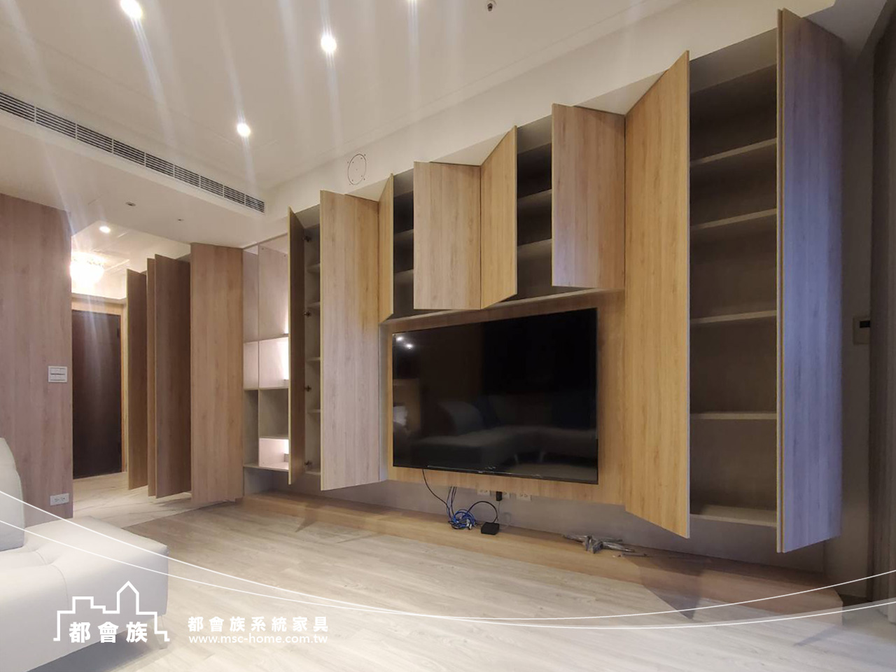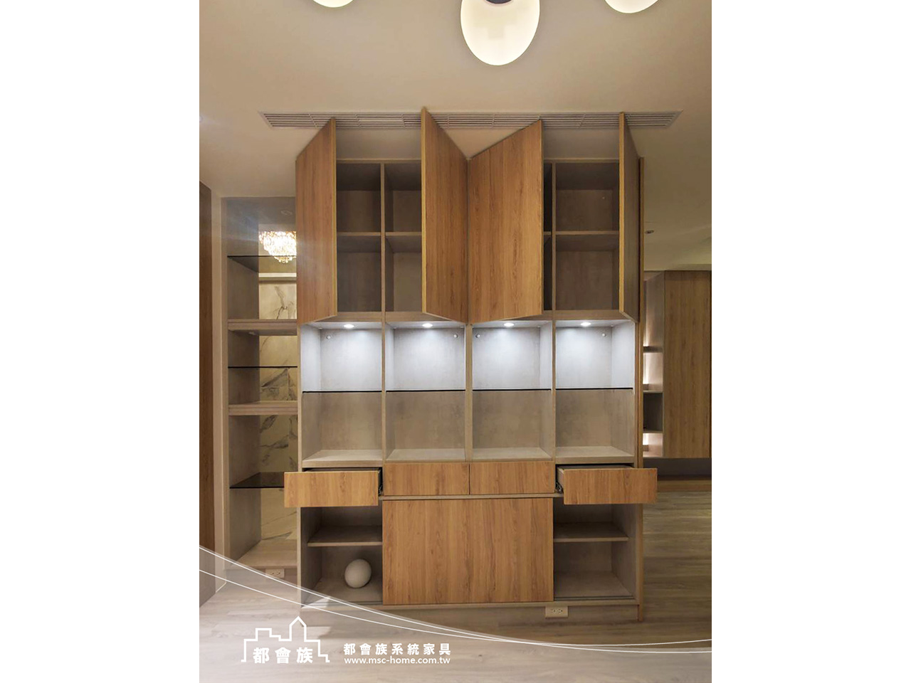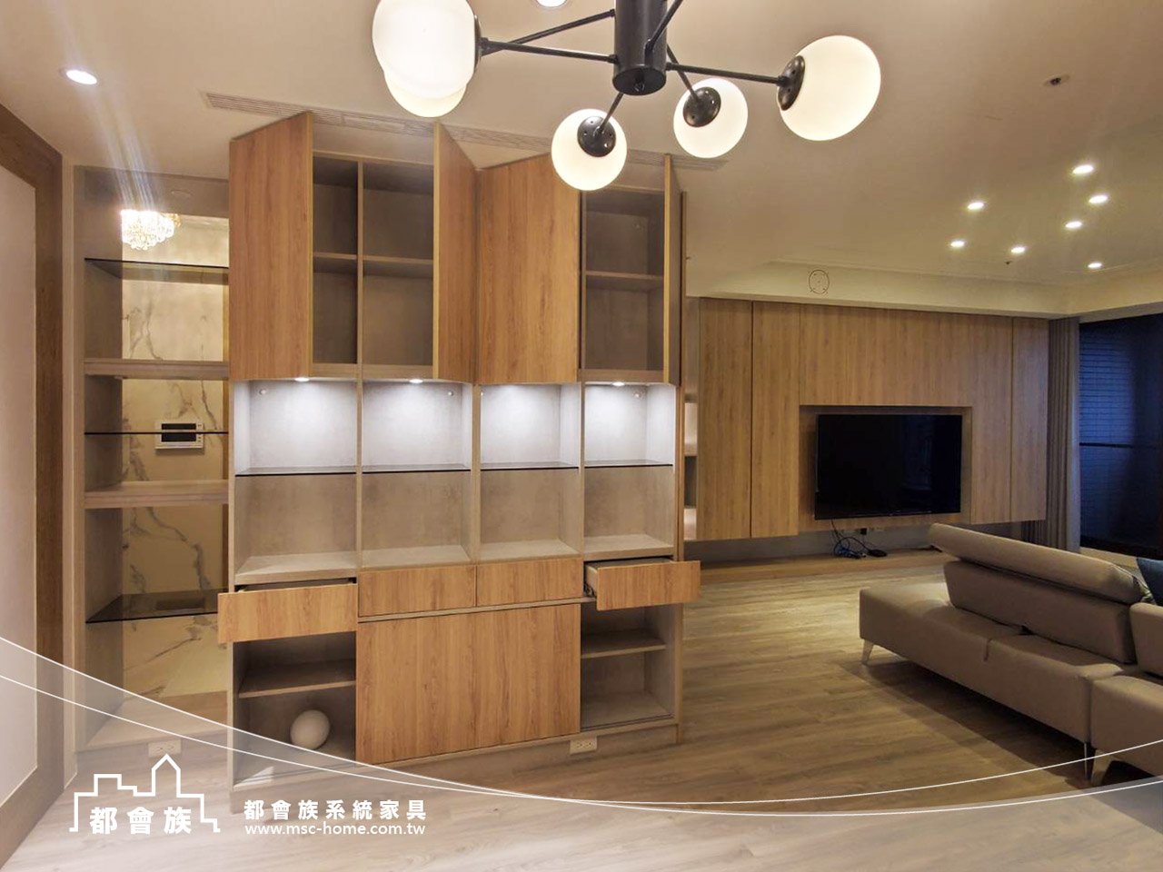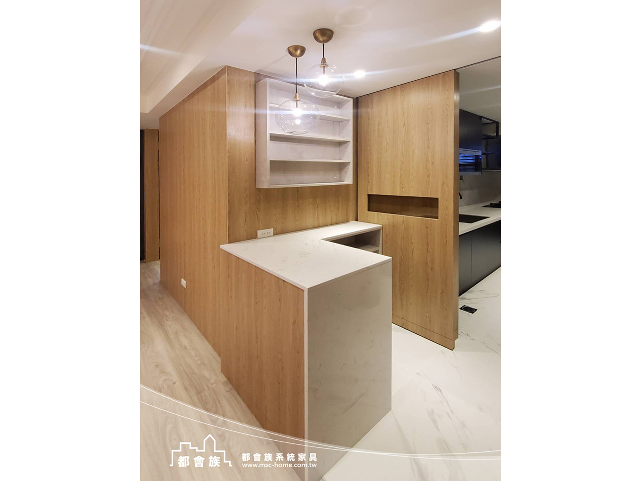 位於林口市區案件, 本案與大覺設計合作, 設計師採用無印風格點綴現代居家風格, 玄關的鞋櫃橡木紋搭配清水模讓空間更顯沉穩靜寧, 餐邊櫃中間開放嵌燈增加造型, 結合玻璃層板, 讓餐桌區有專屬展示空間。 臥室空間也是一貫的木質調, 小孩床組也是利用系統櫃收納方式完成, 讓空間充分滿足。