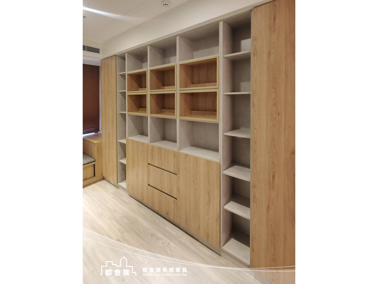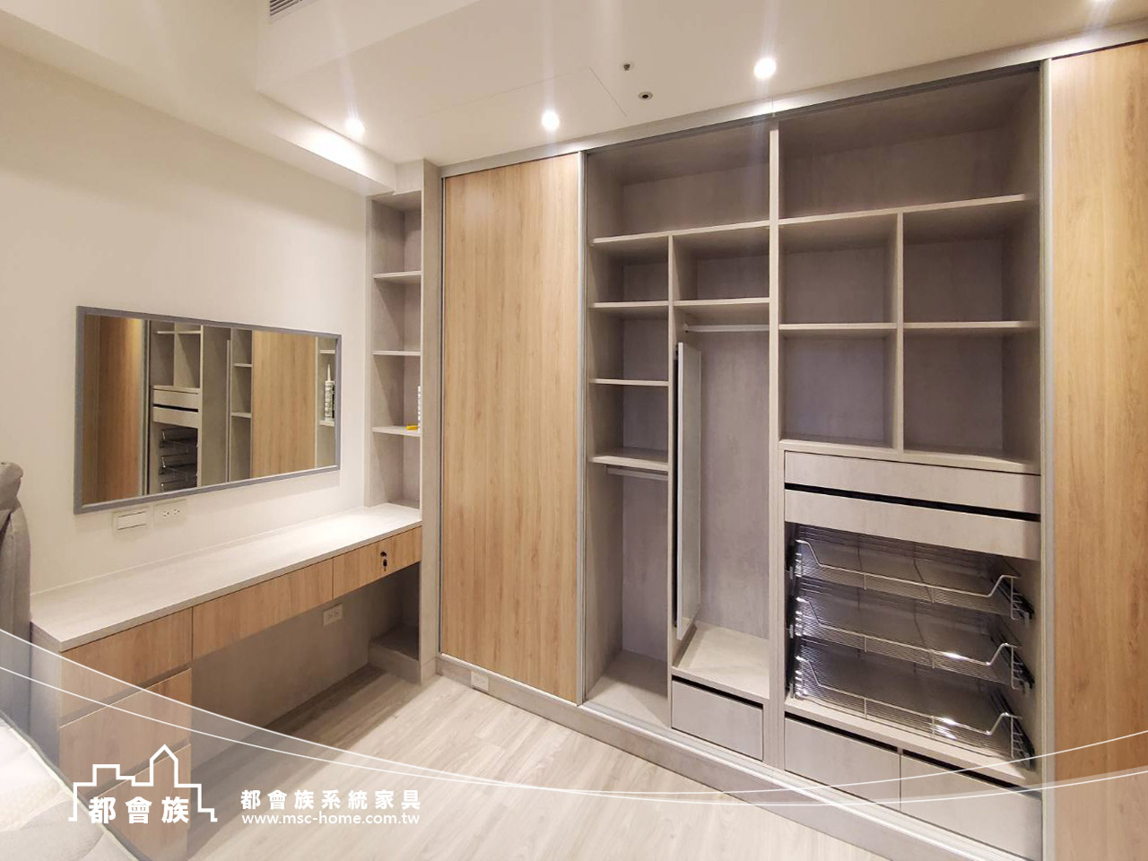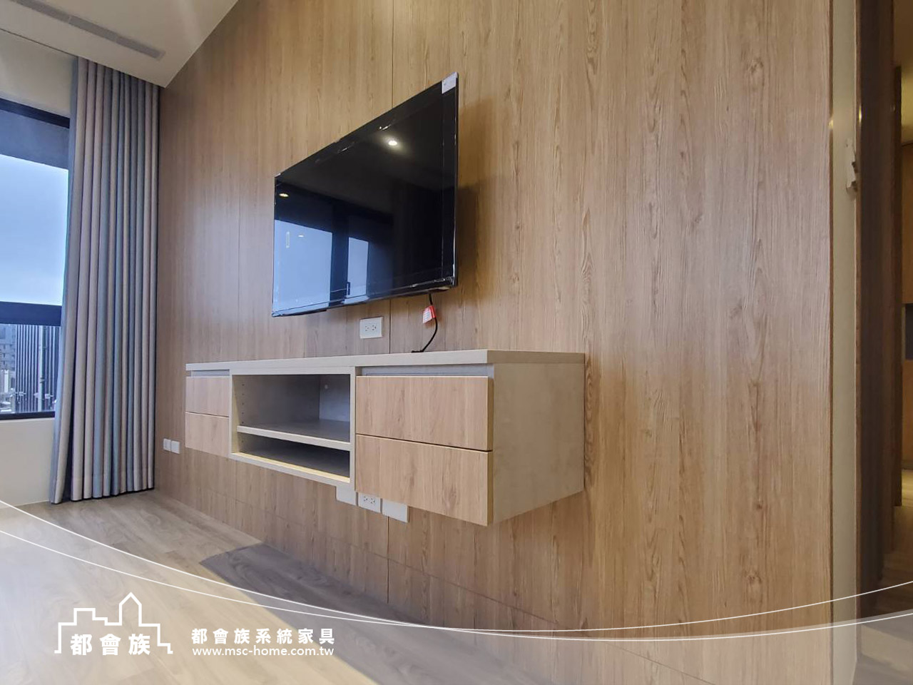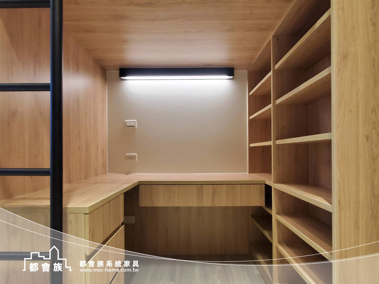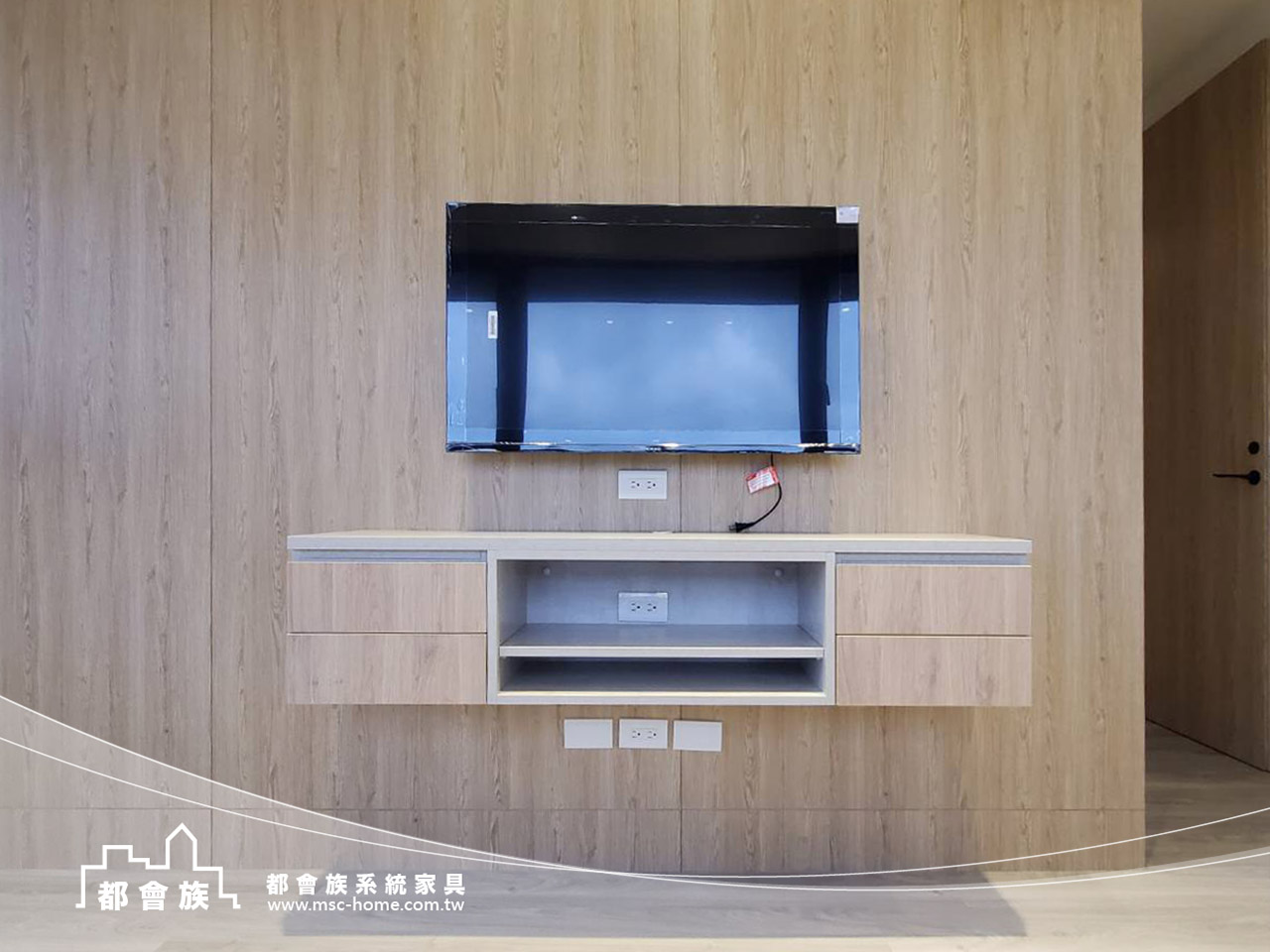 位於林口市區案件, 本案與大覺設計合作, 設計師採用無印風格點綴現代居家風格, 玄關的鞋櫃橡木紋搭配清水模讓空間更顯沉穩靜寧, 餐邊櫃中間開放嵌燈增加造型, 結合玻璃層板, 讓餐桌區有專屬展示空間。 臥室空間也是一貫的木質調, 小孩床組也是利用系統櫃收納方式完成, 讓空間充分滿足。