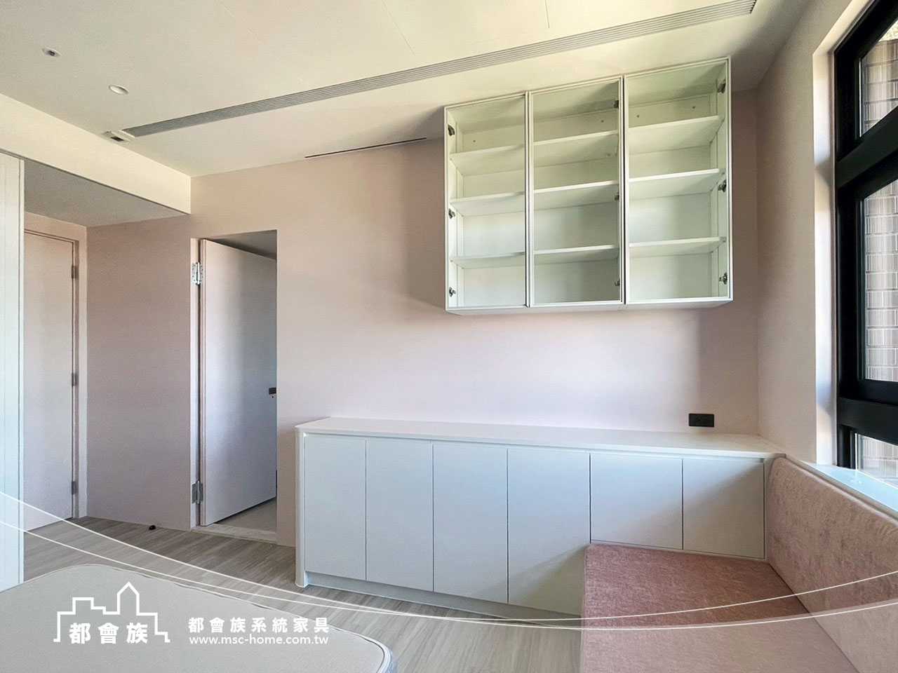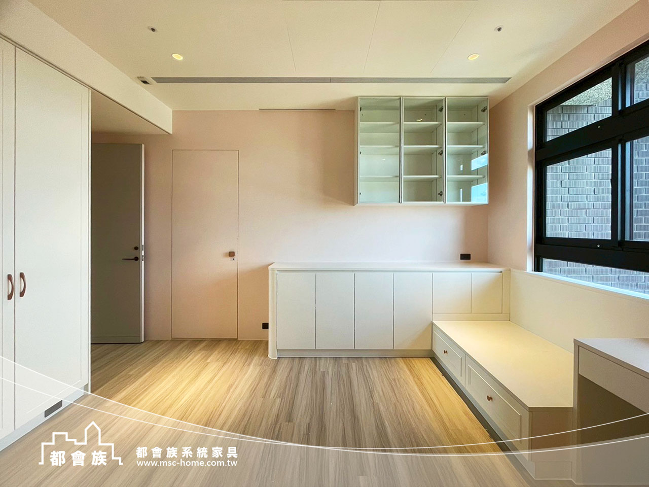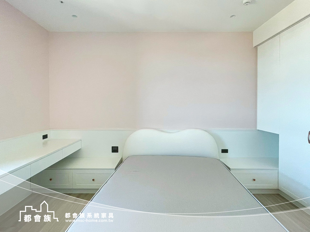 此案件為與瓦第設計合作的案件, 運用大量的白色系統板材作為基調, 搭配低飽和度的粉色牆面, 打破大面積收納櫃的沉重感, 並巧妙運用線條的連貫性, 將書桌、臥榻與矮櫃一氣呵成, 不僅梳理了生活動線, 更為居者預留了充足的採光, 這是一個追求秩序, 卻又不失生活溫度的理想居所。