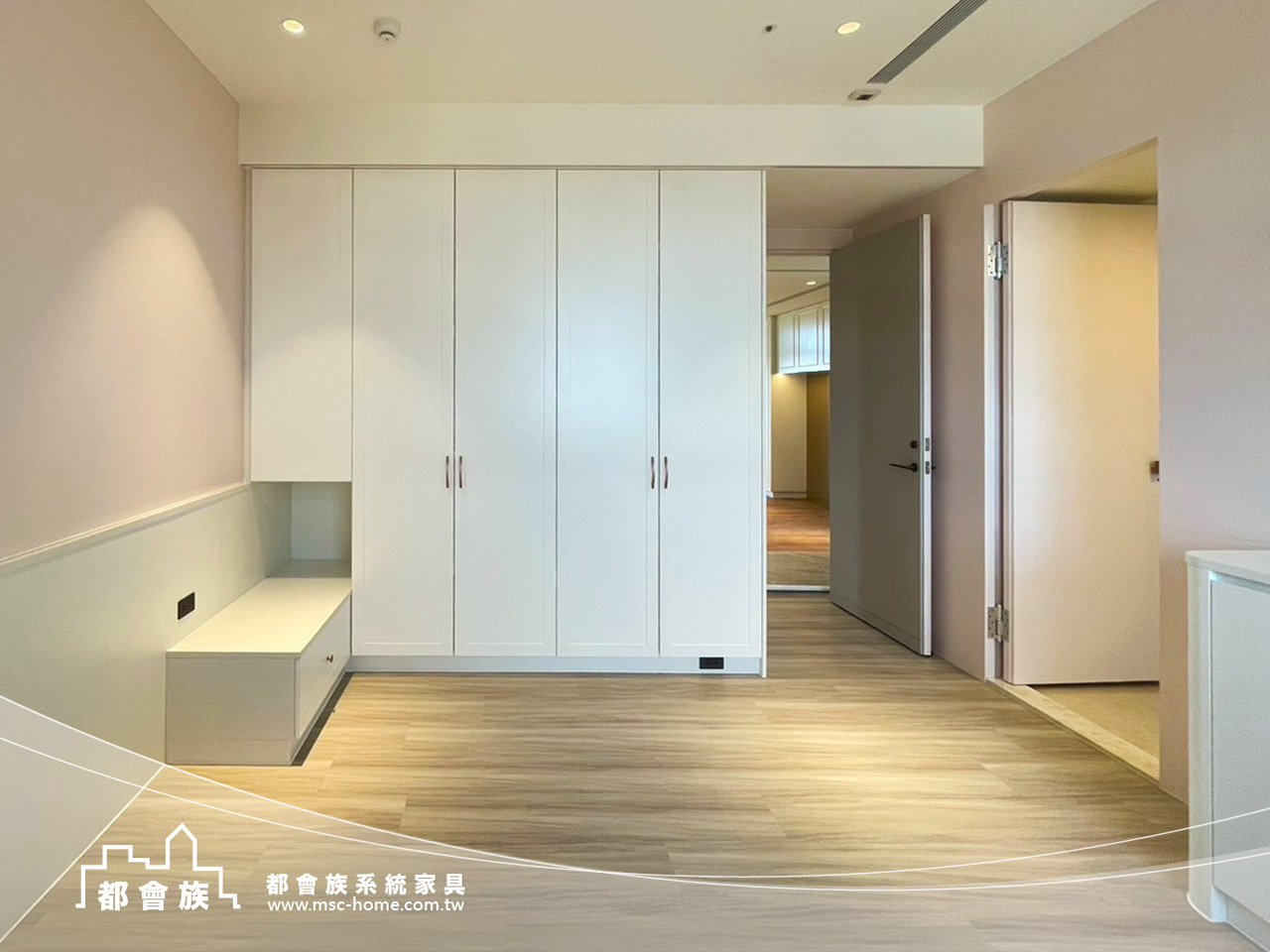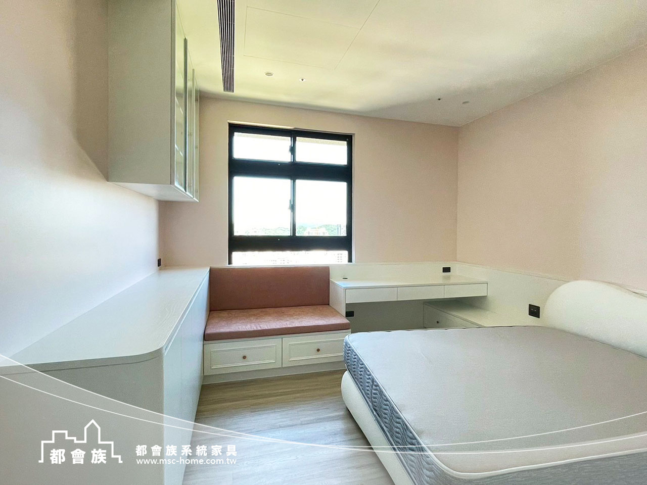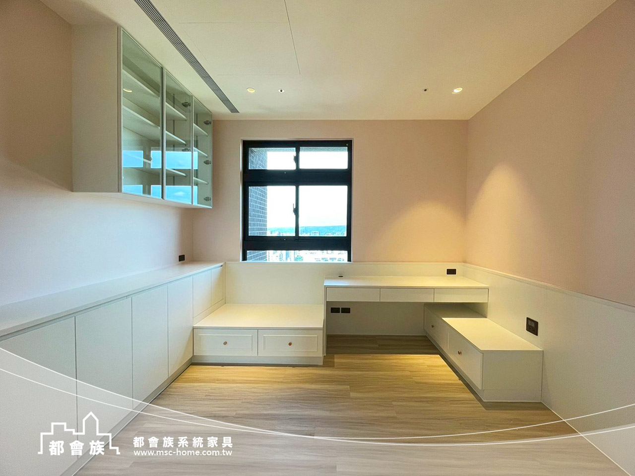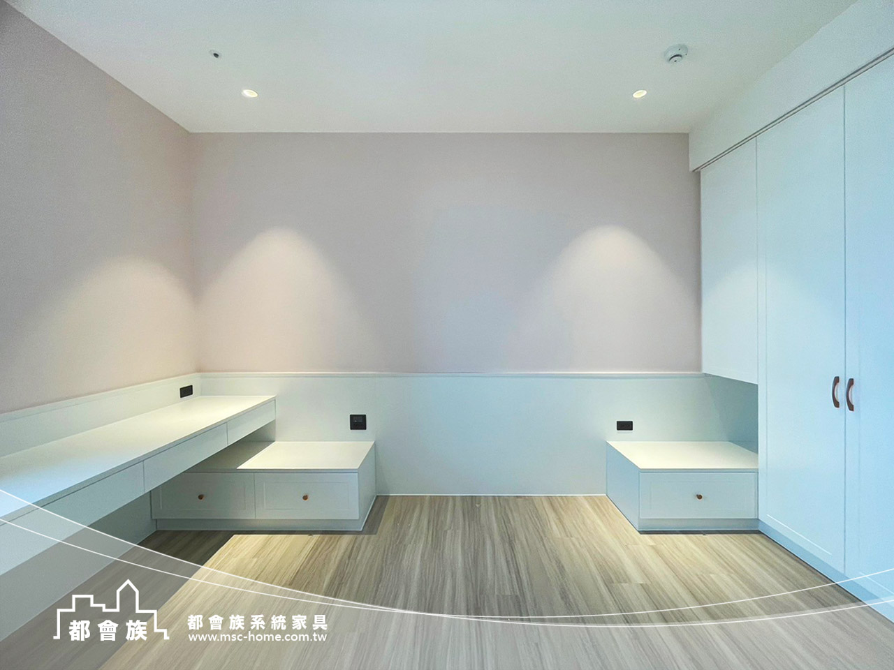 此案件為與瓦第設計合作的案件, 運用大量的白色系統板材作為基調, 搭配低飽和度的粉色牆面, 打破大面積收納櫃的沉重感, 並巧妙運用線條的連貫性, 將書桌、臥榻與矮櫃一氣呵成, 不僅梳理了生活動線, 更為居者預留了充足的採光, 這是一個追求秩序, 卻又不失生活溫度的理想居所。