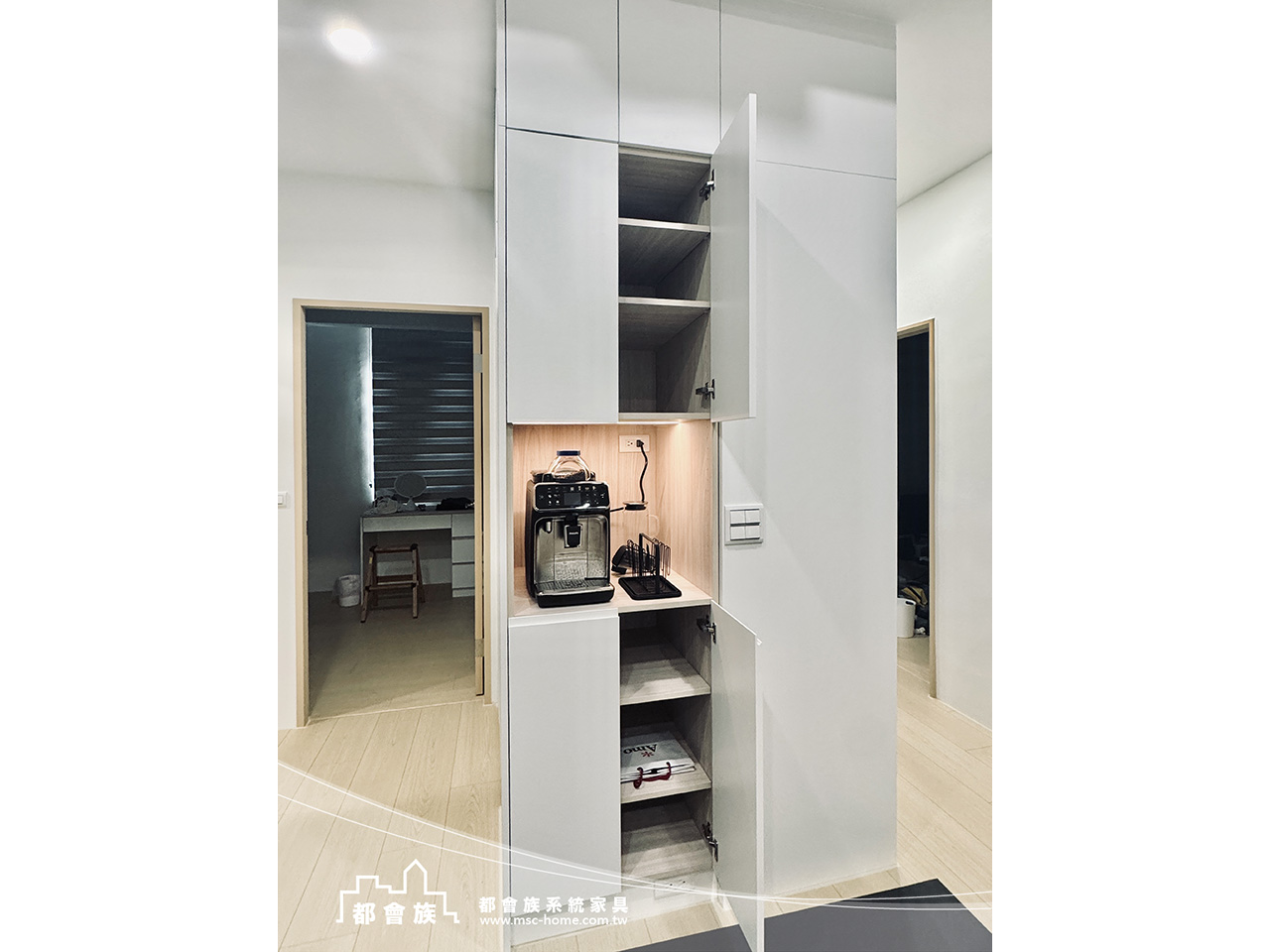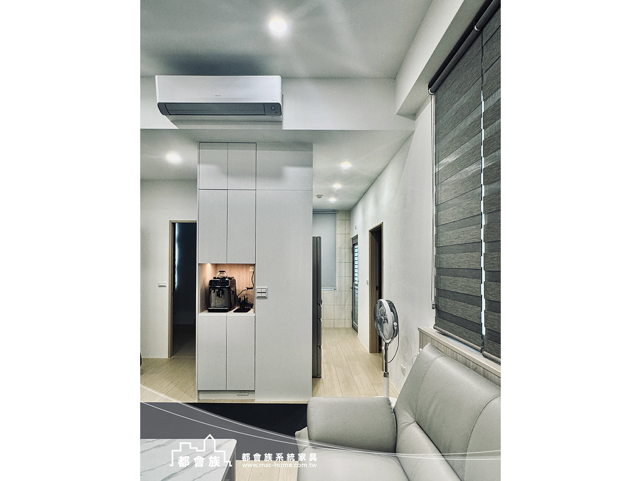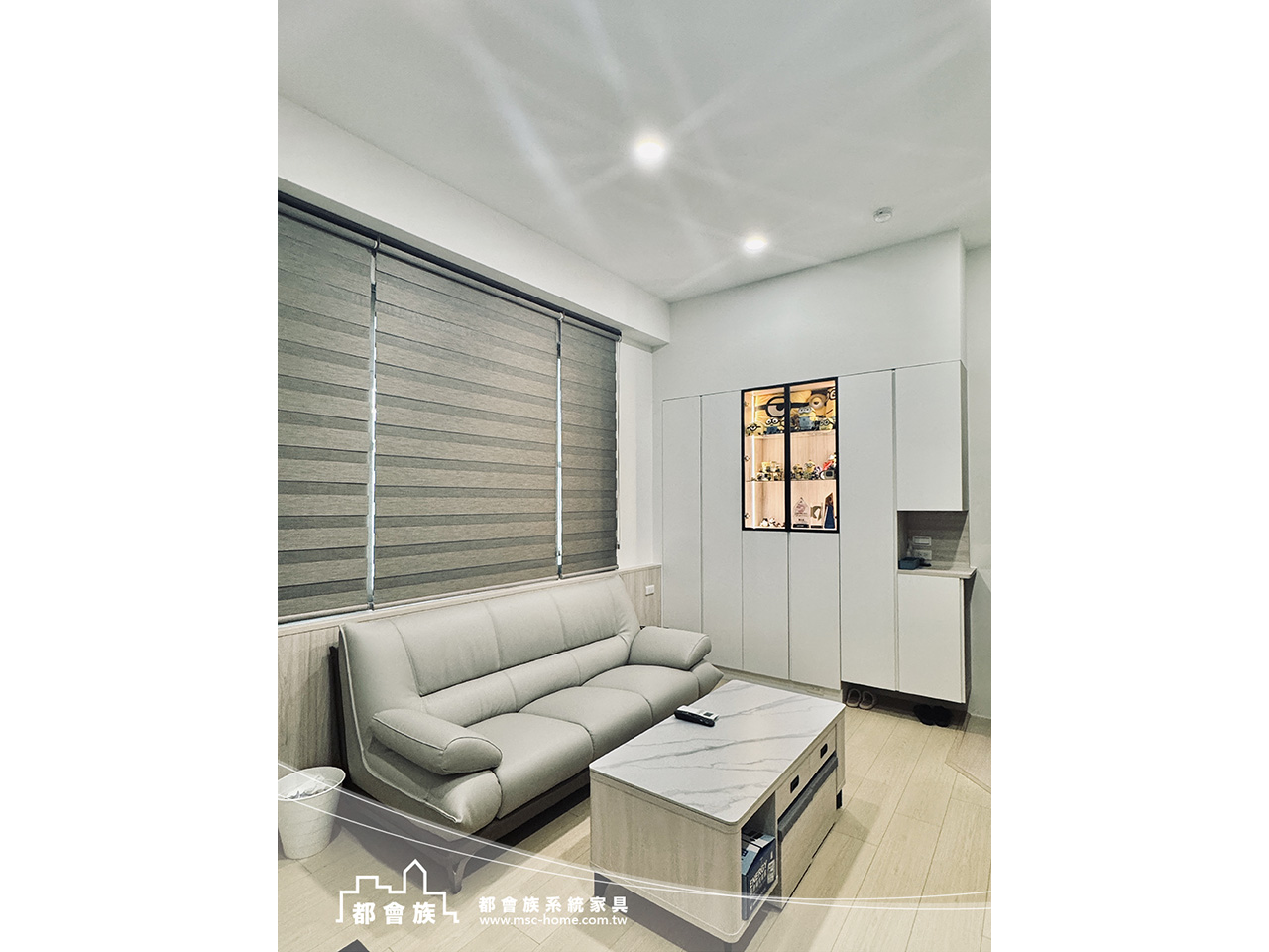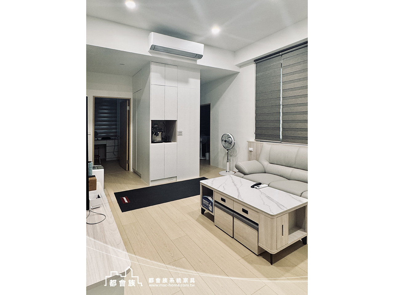 與木樂裝修合作, 整體以淺木色搭配純白系統櫃為主軸, 營造明亮清爽、耐看的居家氛圍。 客廳整合收納與展示機能, 減少零散家具,動線更順暢, 日常整理更輕鬆。 展示區結合燈光設計, 增添溫度與層次。 空間配置保留寬敞走道, 兼顧機能與舒適, 打造實用耐久、貼近日常的理想居家。