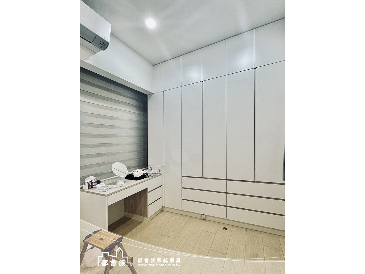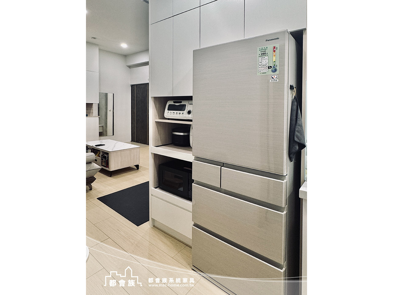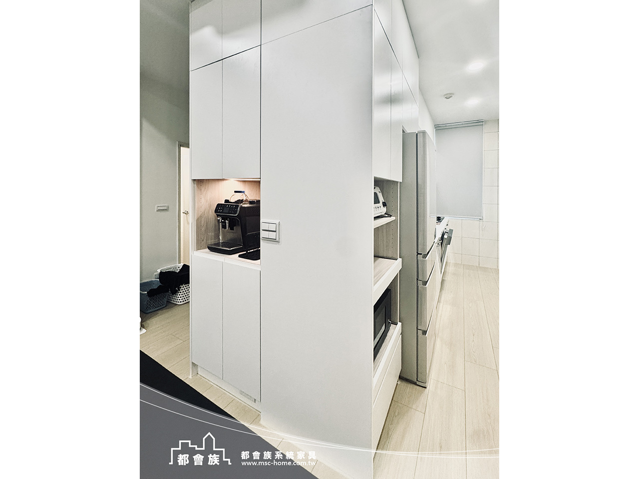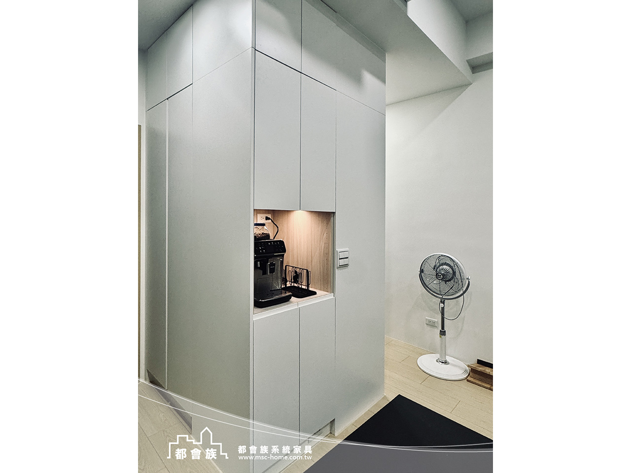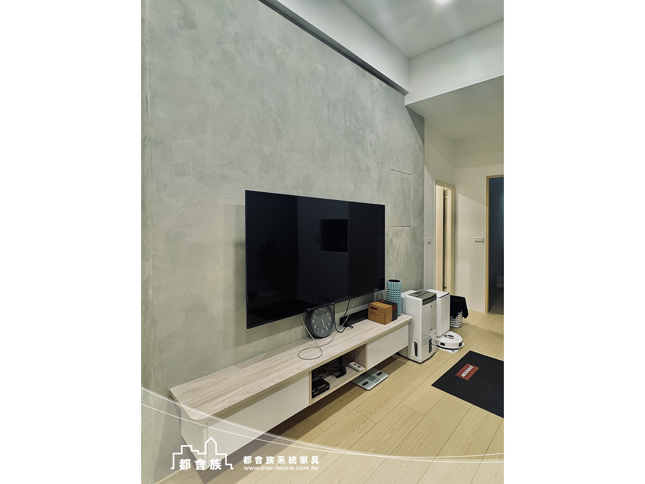 與木樂裝修合作, 整體以淺木色搭配純白系統櫃為主軸, 營造明亮清爽、耐看的居家氛圍。 客廳整合收納與展示機能, 減少零散家具,動線更順暢, 日常整理更輕鬆。 展示區結合燈光設計, 增添溫度與層次。 空間配置保留寬敞走道, 兼顧機能與舒適, 打造實用耐久、貼近日常的理想居家。