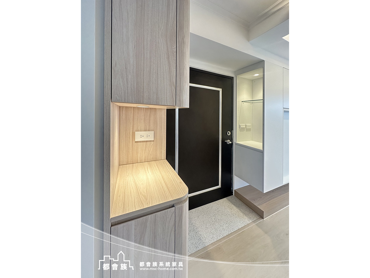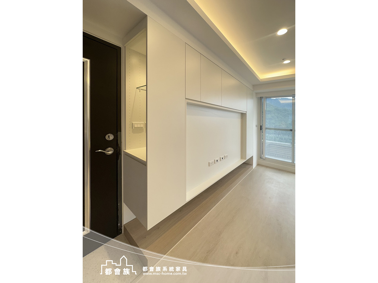 新北深坑住宅, 以溫潤木質與清爽淺色系為主軸, 透過系統櫃整合收納與機能, 打造美感與實用兼具的空間。 客廳電視牆結合隱藏收納與展示設計, 維持俐落視覺; 玄關運用燈光營造溫暖迎接。 窗邊臥榻串聯收納機能, 延伸層次與生活感, 整體呈現簡約舒適、恰到好處的居家氛圍。