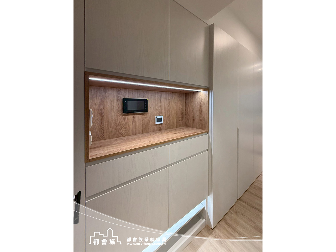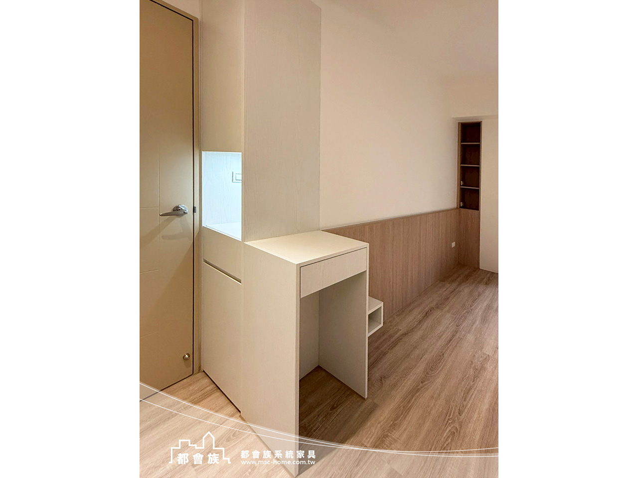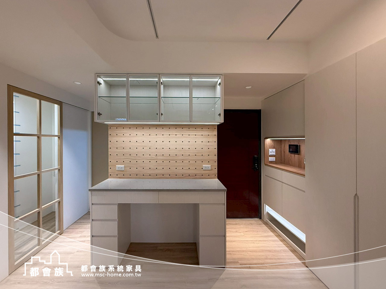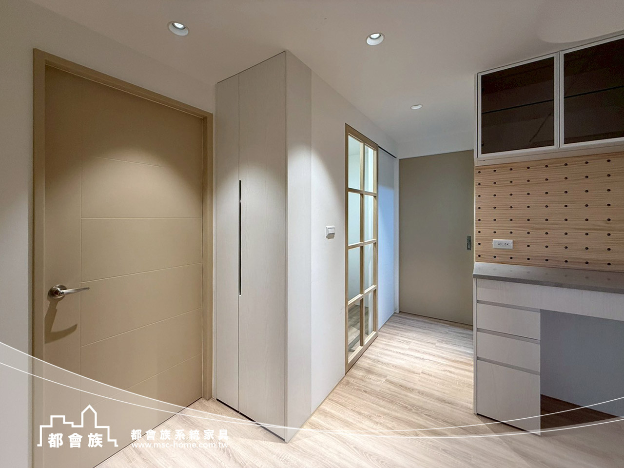 此案是與立丞設計合作, 整體是無印簡約風格, 用淺木紋搭配柔和米白, 沒有過多裝飾, 靠系統櫃把空間整理得剛剛好, 玄關鞋櫃下滿足屋主想要的抽拉板, 一進門讓脫鞋更輕鬆。 系統櫃結合木工並加上洞洞板設計, 可以依生活習慣自由調整。 實用又有一點生活感, 上方吊櫃用玻璃門片, 讓空間多了點輕盈的層次。 房間裡也滿足了屋主的想法與規劃, 把收納、機能都整合進去, 讓動線變得更順、更好用。