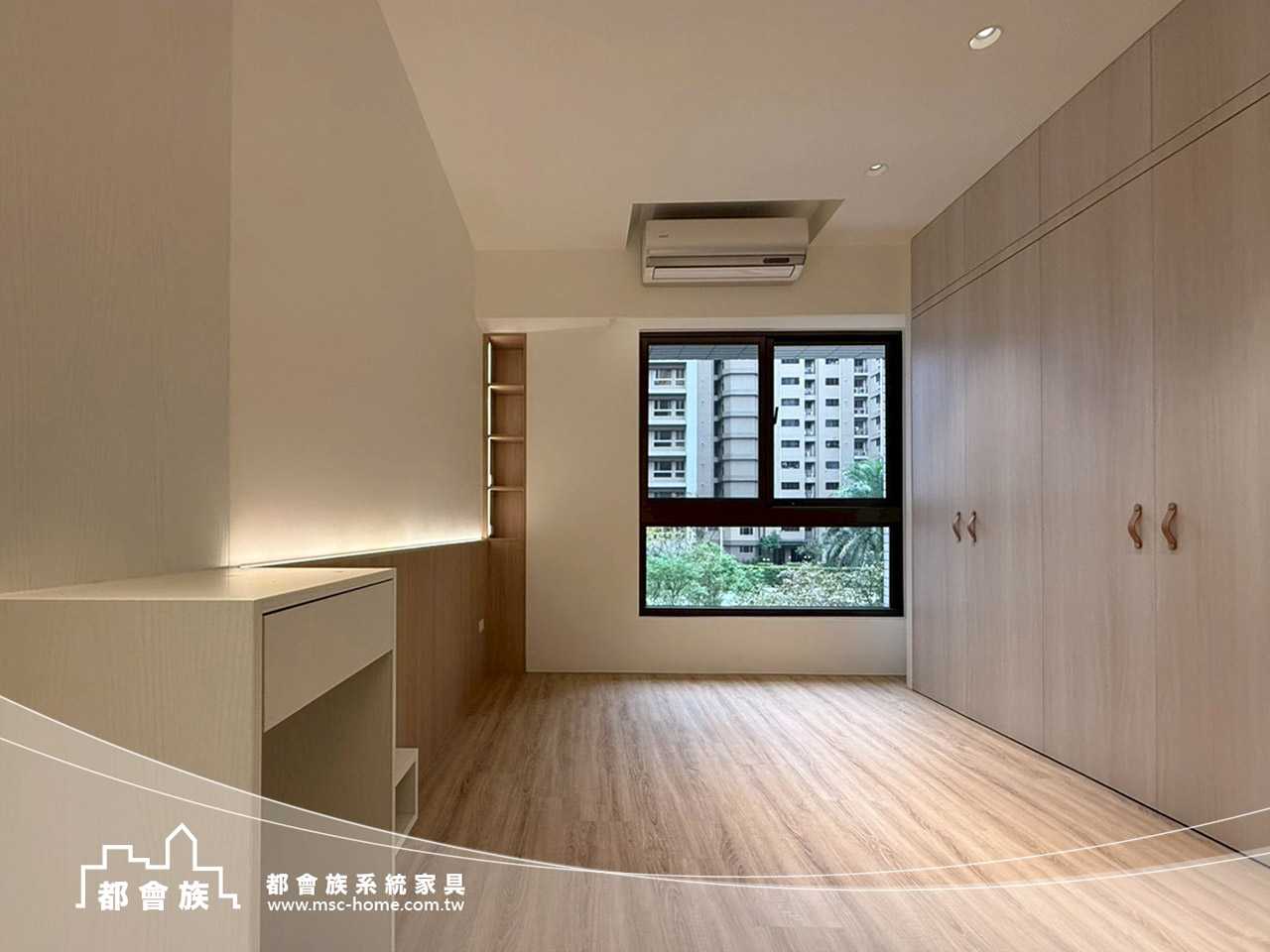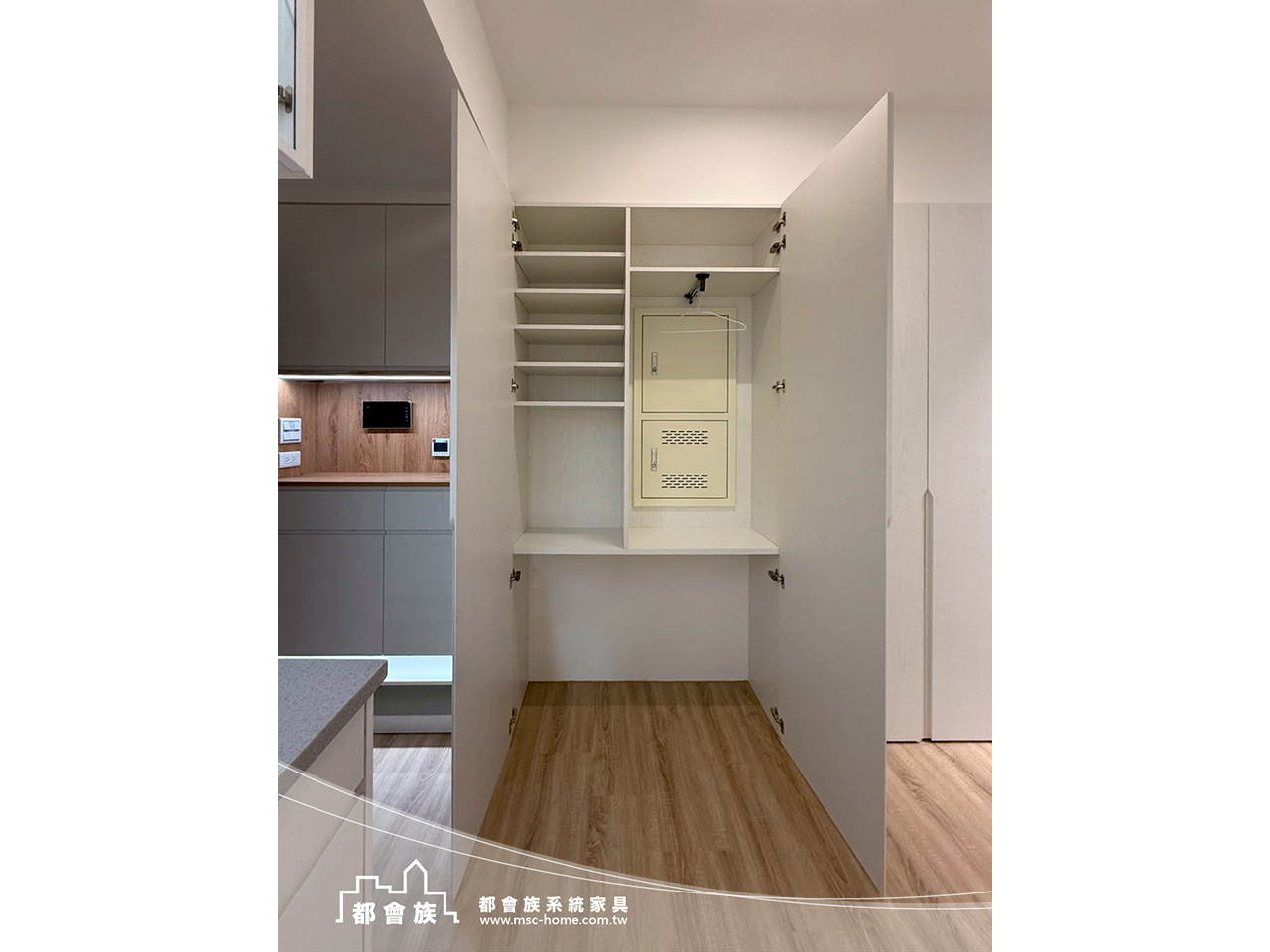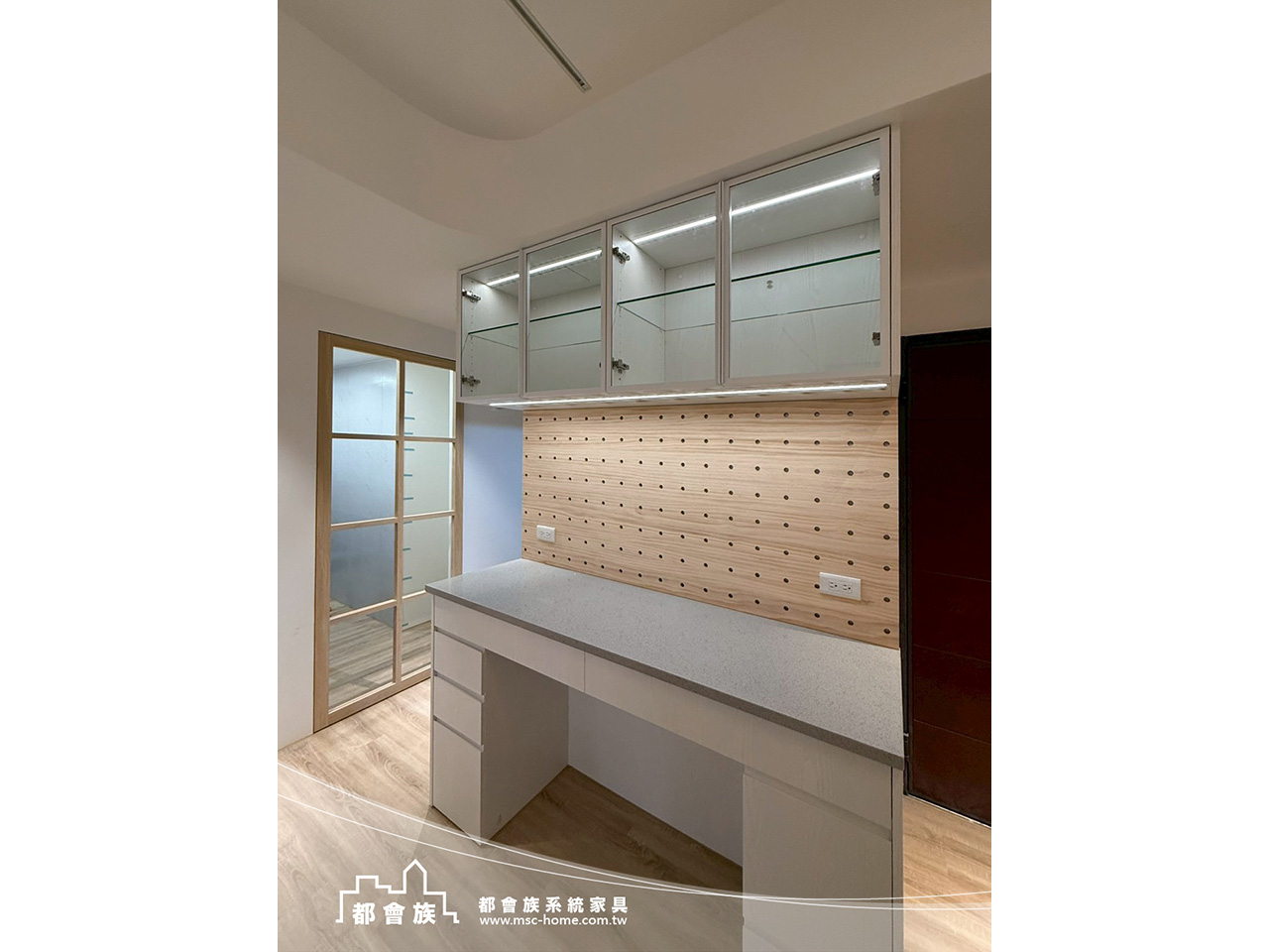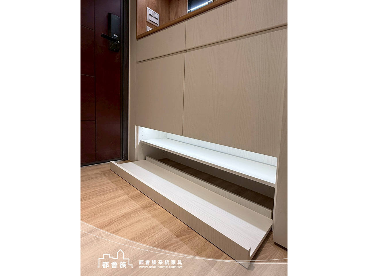 此案是與立丞設計合作, 整體是無印簡約風格, 用淺木紋搭配柔和米白, 沒有過多裝飾, 靠系統櫃把空間整理得剛剛好, 玄關鞋櫃下滿足屋主想要的抽拉板, 一進門讓脫鞋更輕鬆。 系統櫃結合木工並加上洞洞板設計, 可以依生活習慣自由調整。 實用又有一點生活感, 上方吊櫃用玻璃門片, 讓空間多了點輕盈的層次。 房間裡也滿足了屋主的想法與規劃, 把收納、機能都整合進去, 讓動線變得更順、更好用。