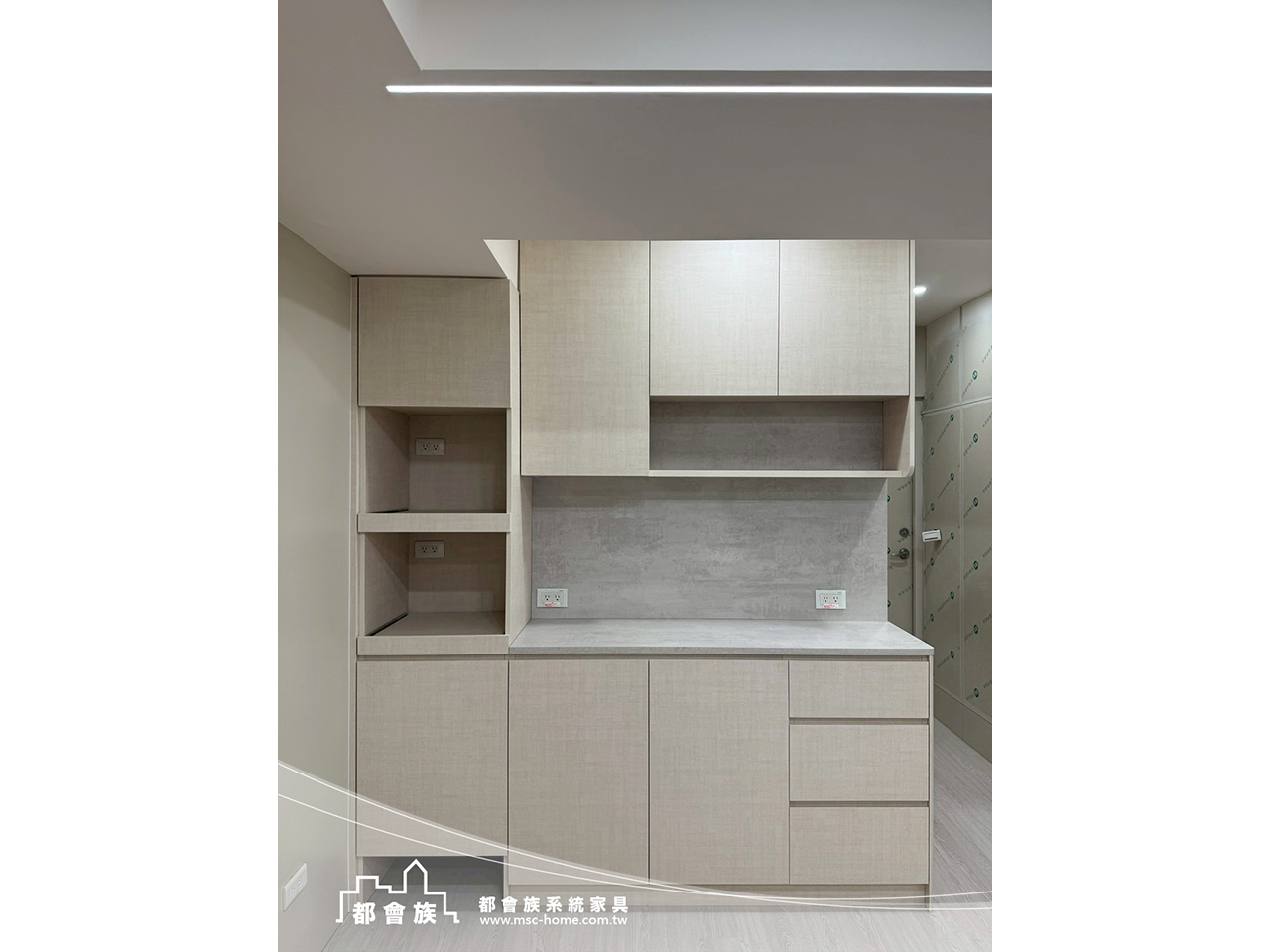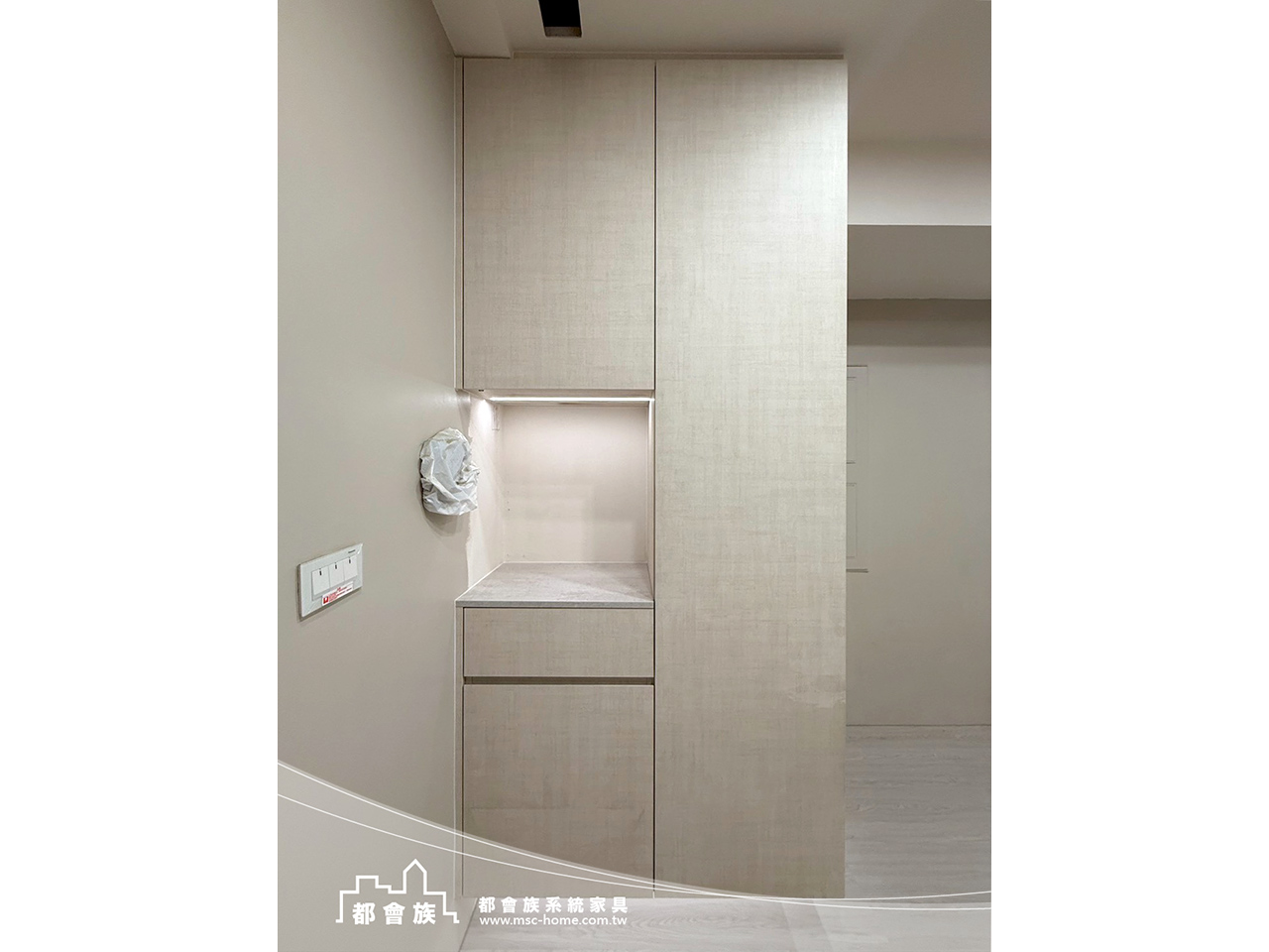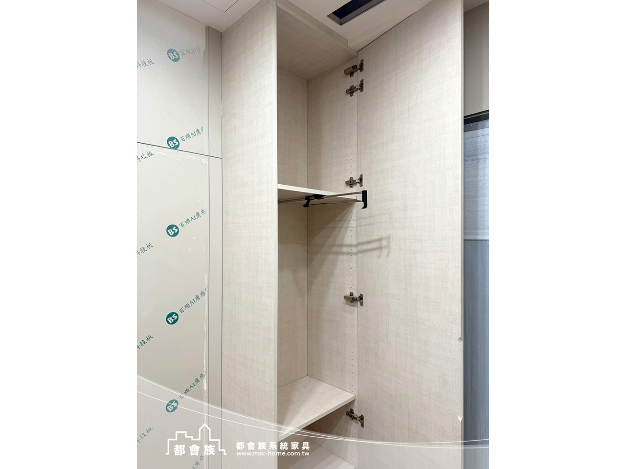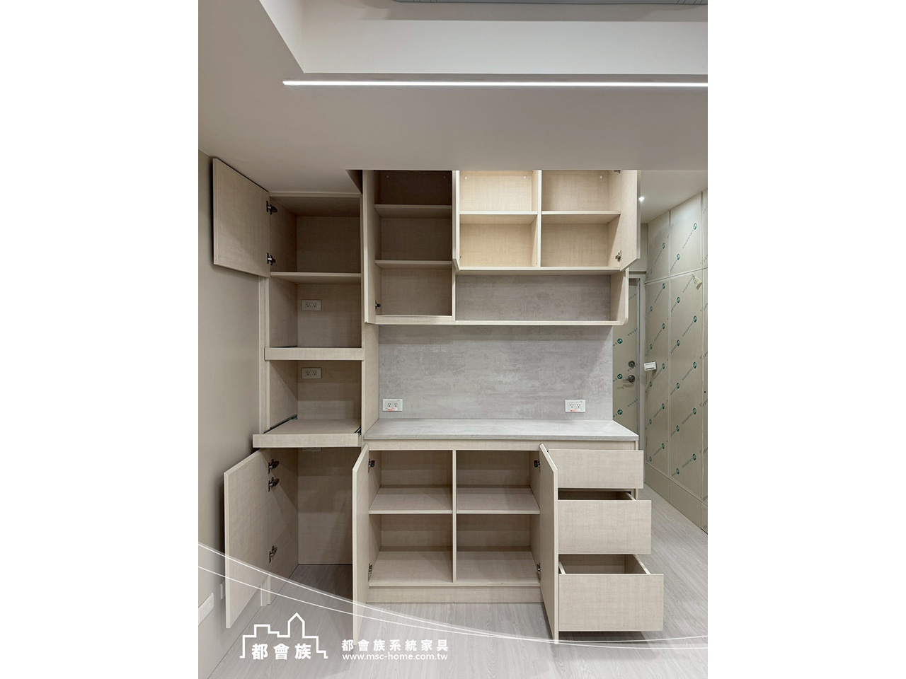 這次的居家規劃以溫潤的奶茶色為主軸, 搭配細膩的布紋質感板材, 營造出柔和且耐看的空間氛圍。 整體採用系統櫃設計, 依照屋主生活習慣進行客製化配置, 不僅提升收納效率,也讓動線更加順暢。 開放式更衣間結合吊掛與層架機能, 兼具展示與實用性,打造如精品櫃般的整齊視覺。 書桌與收納櫃體一體成型,兼顧工作與生活需求。 每一處細節皆以實用與美感並重, 讓空間在簡約中展現質感,呈現舒適且高機能的理想居家。