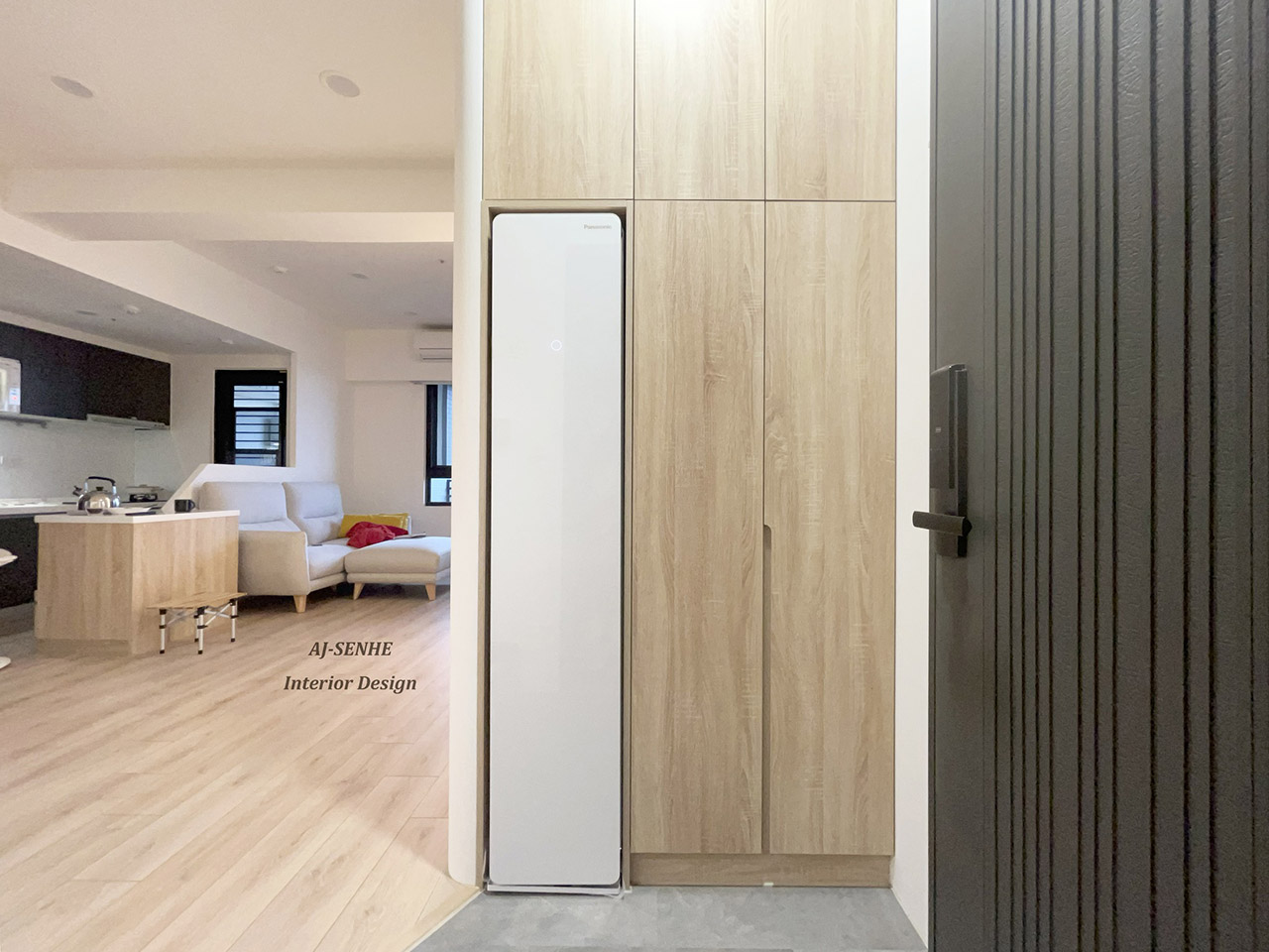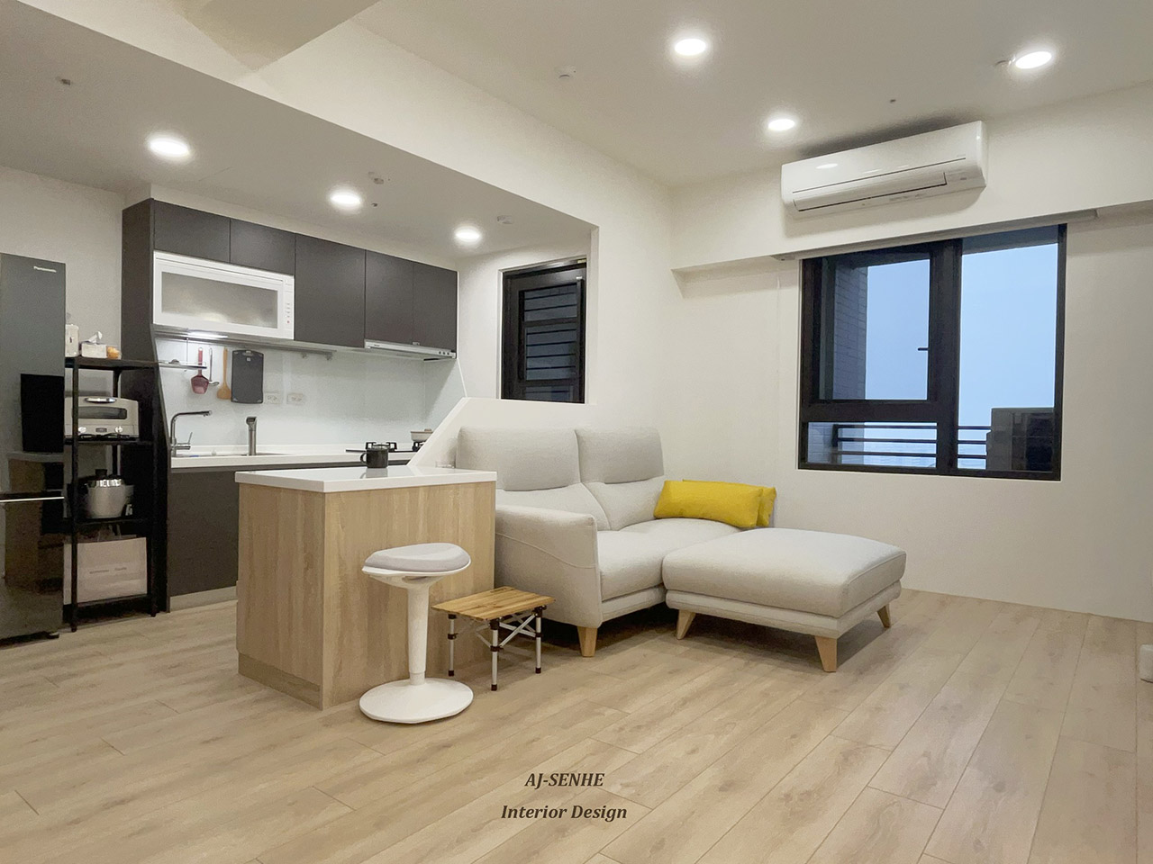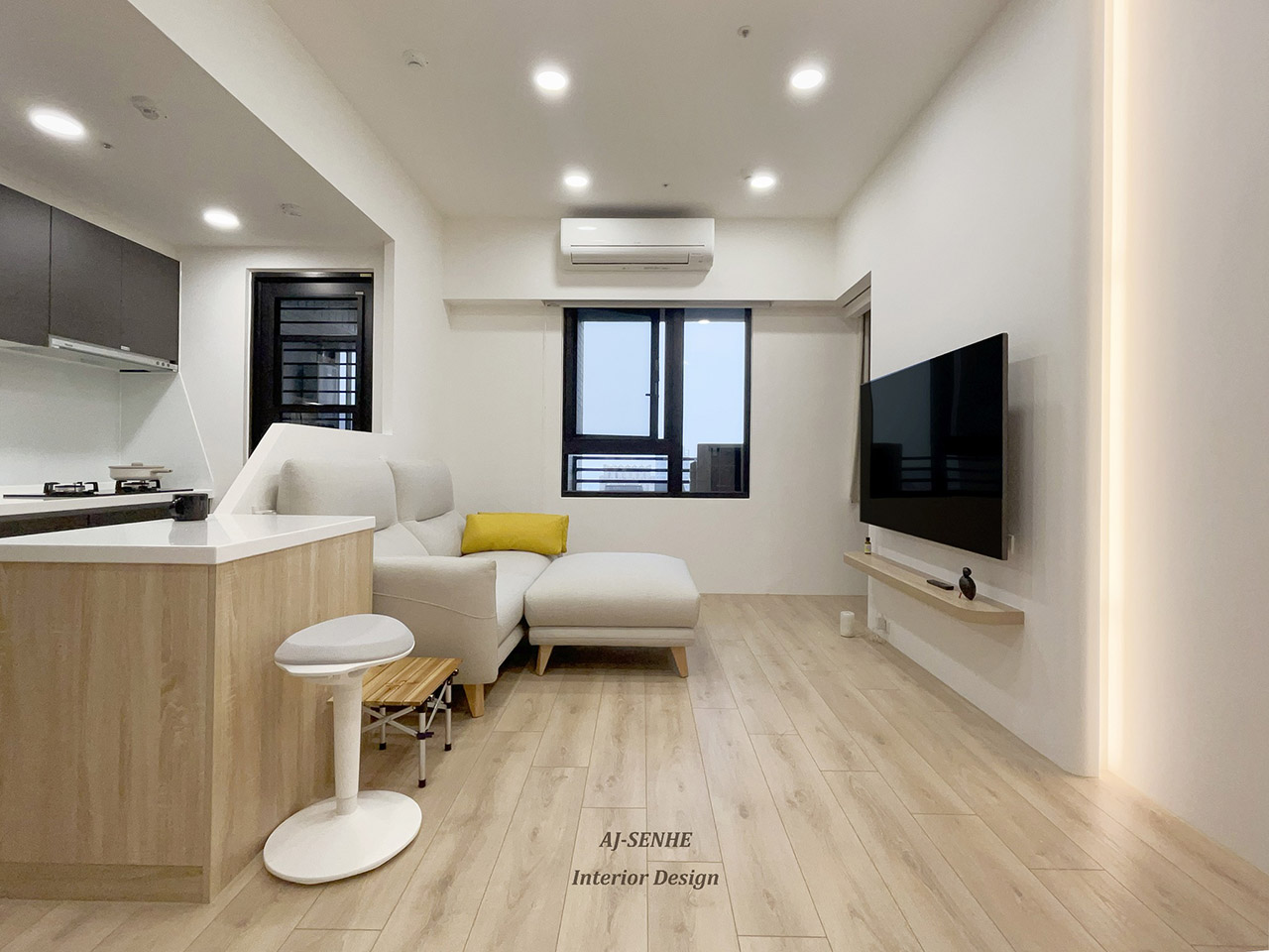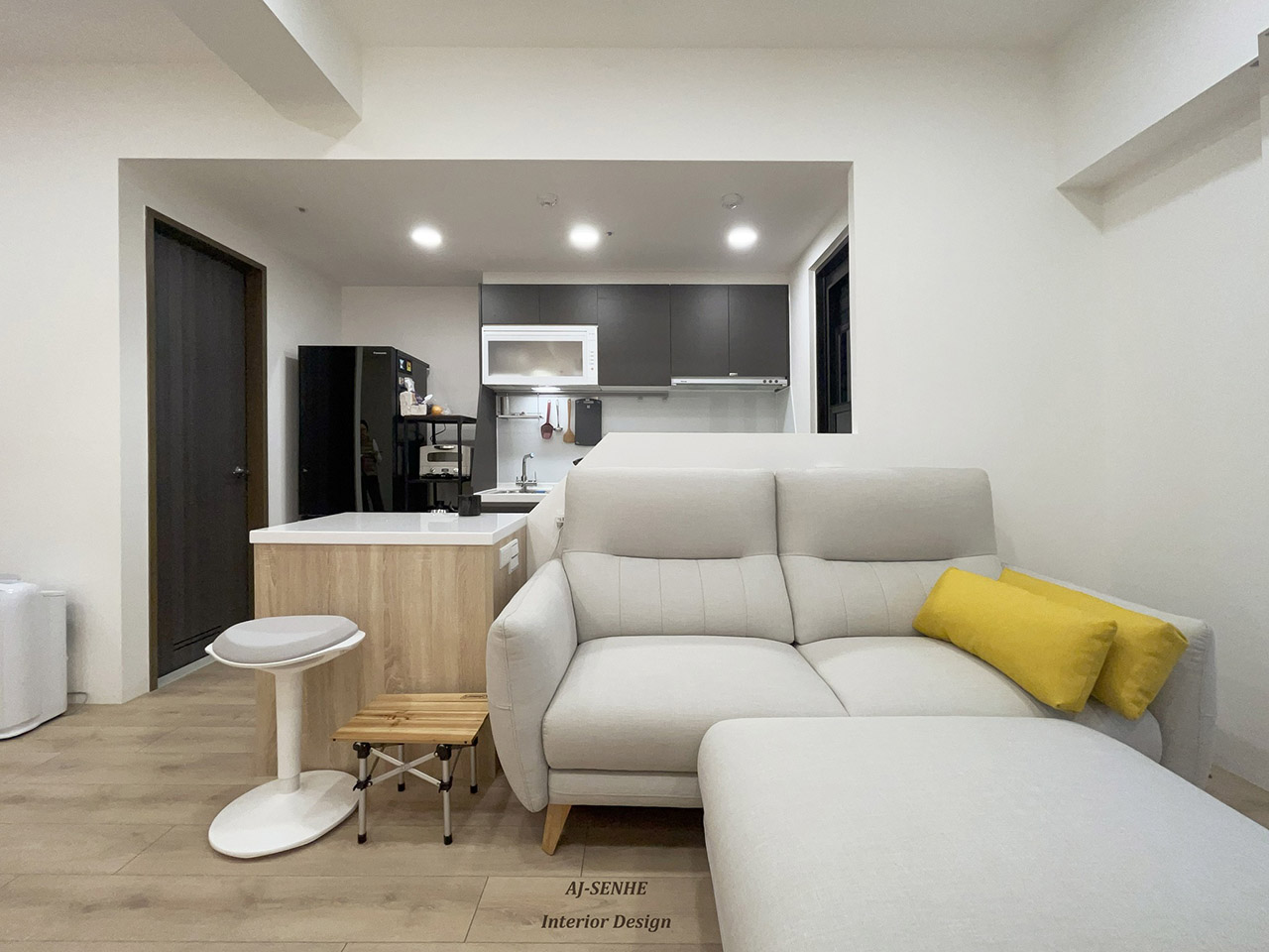 此案件為與 AJ設計 合作的案件, 物件本身為3房的配置,建材相互融合與燈條搭配, 此無繁複的裝飾搭配上輕柔感木紋系統櫃 溫雅氛圍,瀰漫在每一處。 點綴上溫潤的間接照明, 活潑了空間,也形成一大亮點。 玄關處特意設置落塵區, 讓出入有所緩衝, 並將電子衣櫥融合收納櫃, 讓清新與美觀同時具備, 將原本的兩房打通, 搭配上開放式廚房延伸整體空間的視野, 精巧的收納設計與圓潤弧度, 為單身女性量身打造明亮溫馨的宅邸。