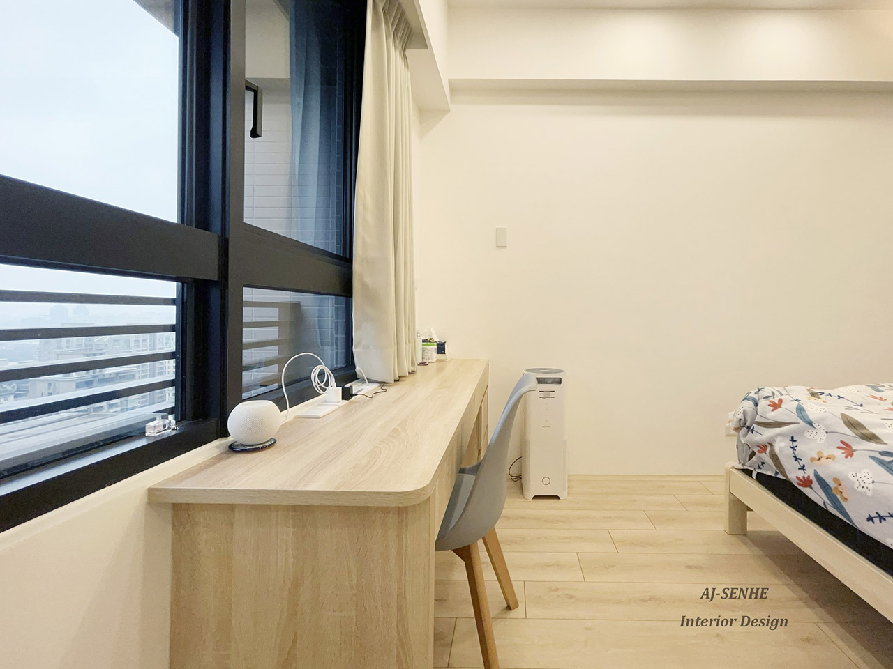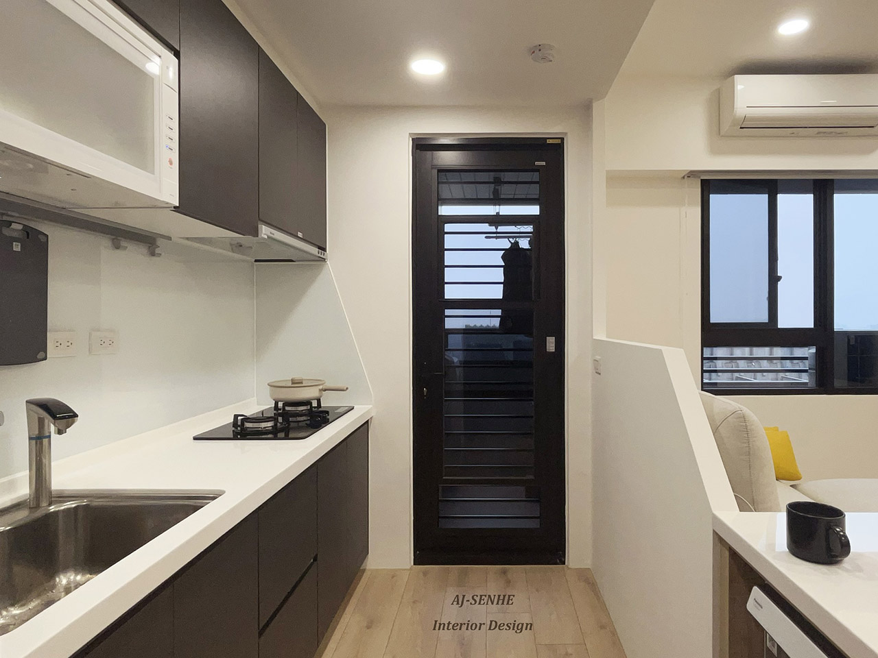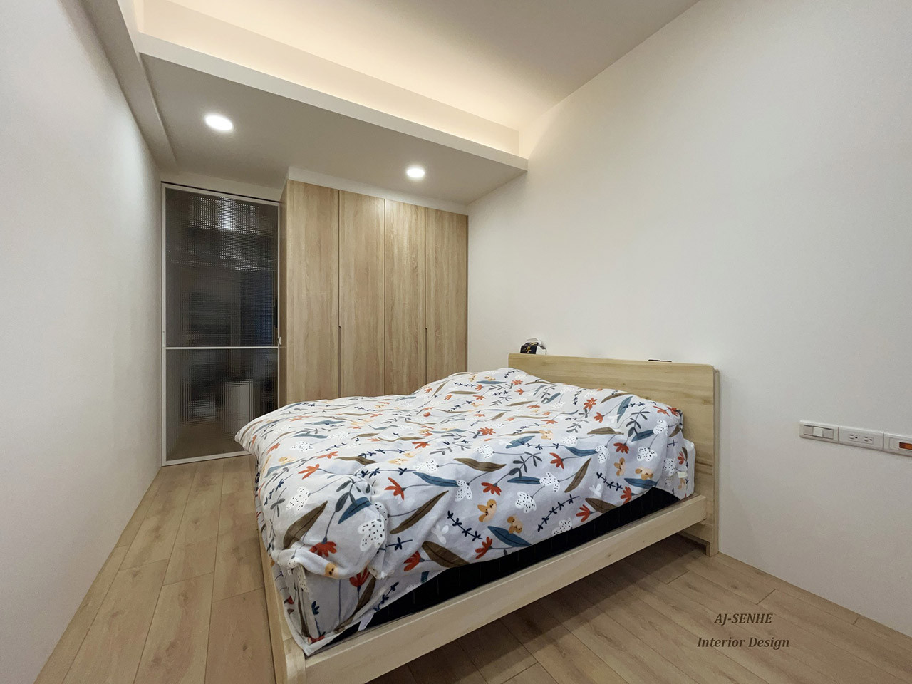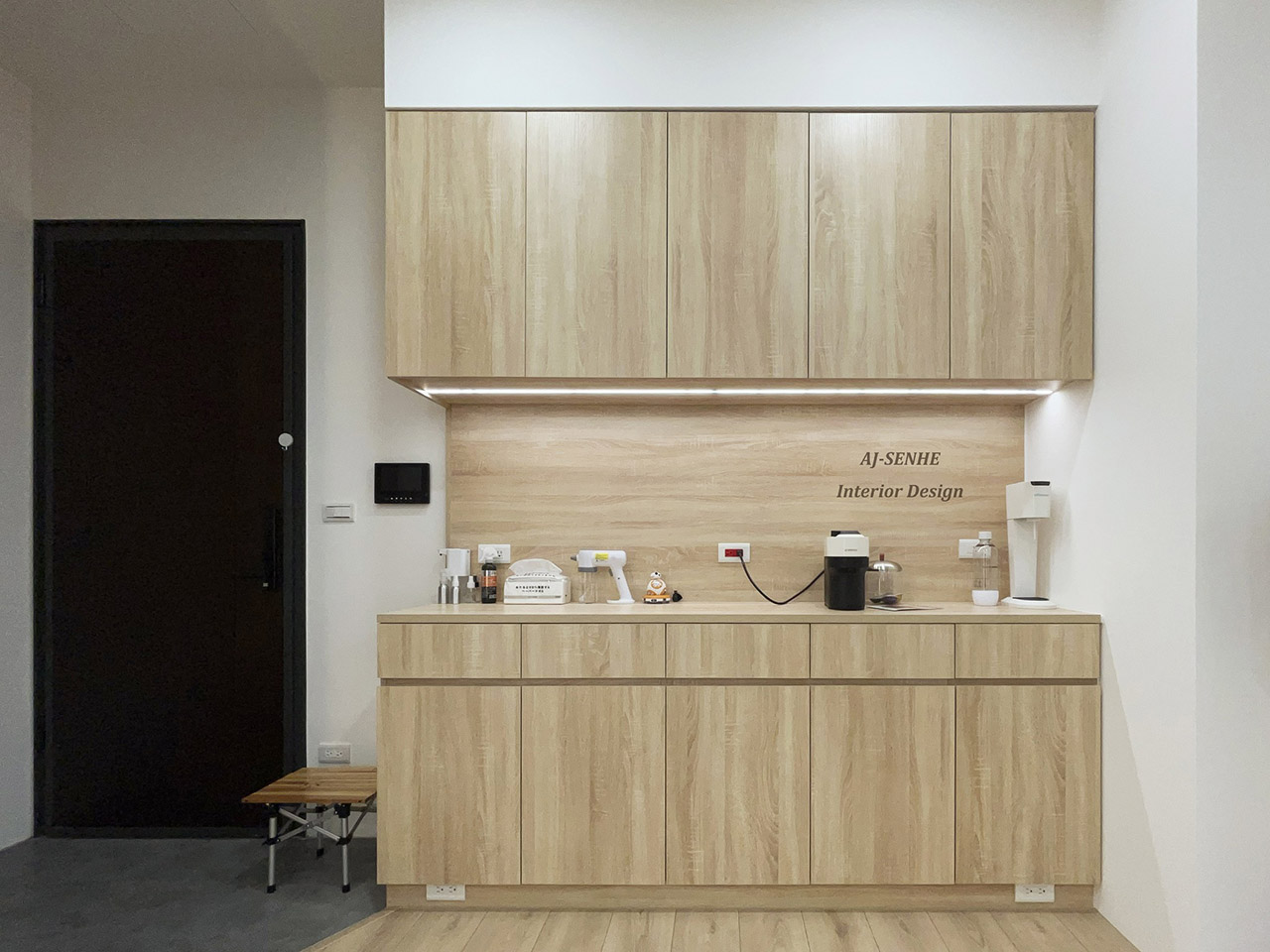 此案件為與 AJ設計 合作的案件, 物件本身為3房的配置,建材相互融合與燈條搭配, 此無繁複的裝飾搭配上輕柔感木紋系統櫃 溫雅氛圍,瀰漫在每一處。 點綴上溫潤的間接照明, 活潑了空間,也形成一大亮點。 玄關處特意設置落塵區, 讓出入有所緩衝, 並將電子衣櫥融合收納櫃, 讓清新與美觀同時具備, 將原本的兩房打通, 搭配上開放式廚房延伸整體空間的視野, 精巧的收納設計與圓潤弧度, 為單身女性量身打造明亮溫馨的宅邸。